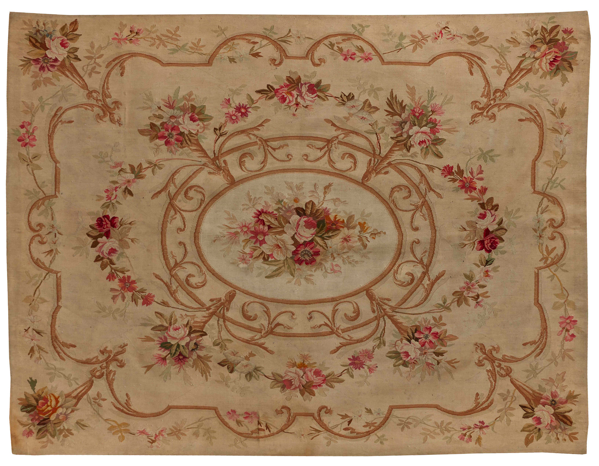 Aubusson Francia fine XIX secolo campo verde chiaro, medaglione centrale con bouquet e vasi di fiori, vasi floreali negli angoli, W. 179 - D. 133 cm, Azizian, Milano