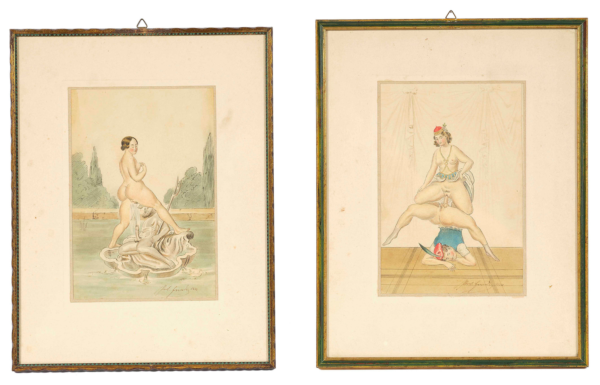 20 scene erotiche Artista del XIX secolo serie di disegni acquerellati su carta con passepartout e piccola cornice in legno, cm 20x14, Galleria d'Arte Armondi, Brescia