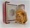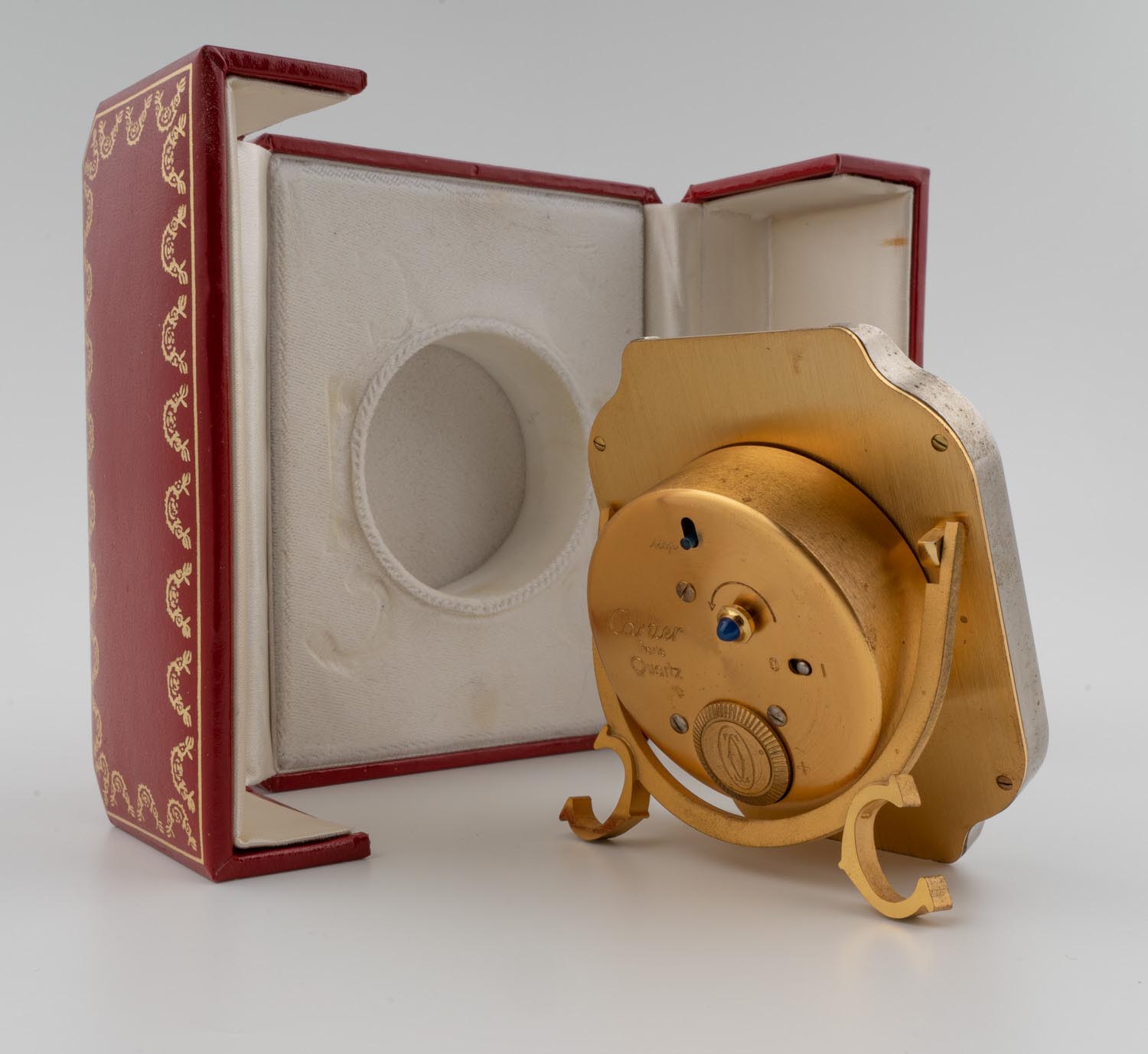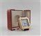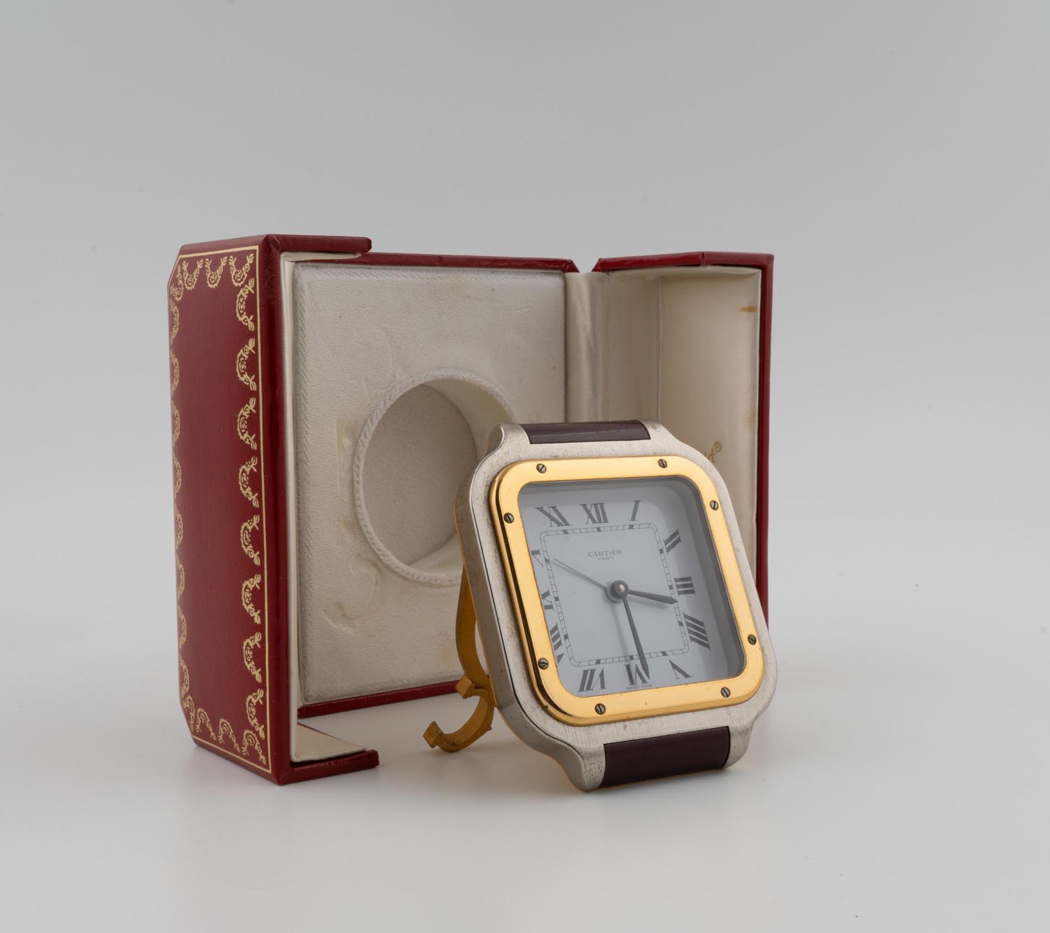 Modello Santos in metallo dorato e applicazioni in smalto, quadrante bianco con numeri romani.