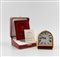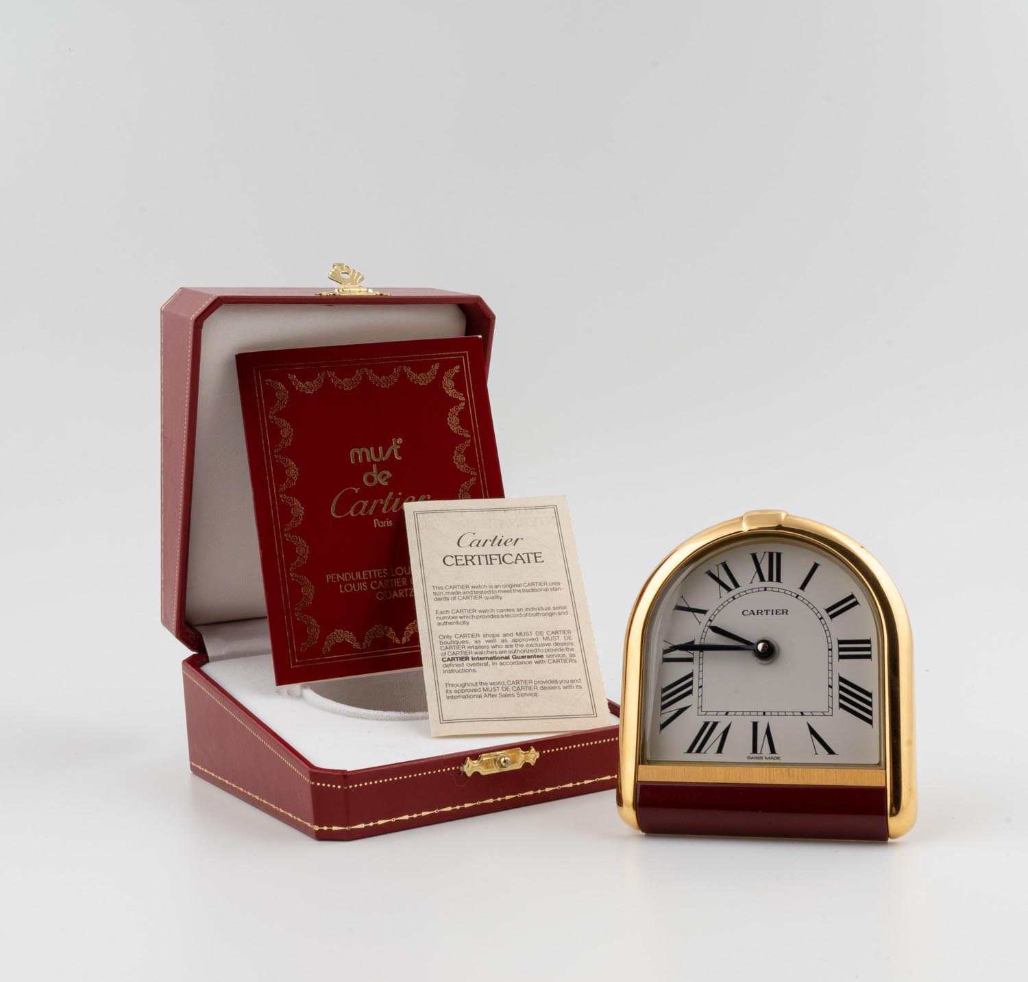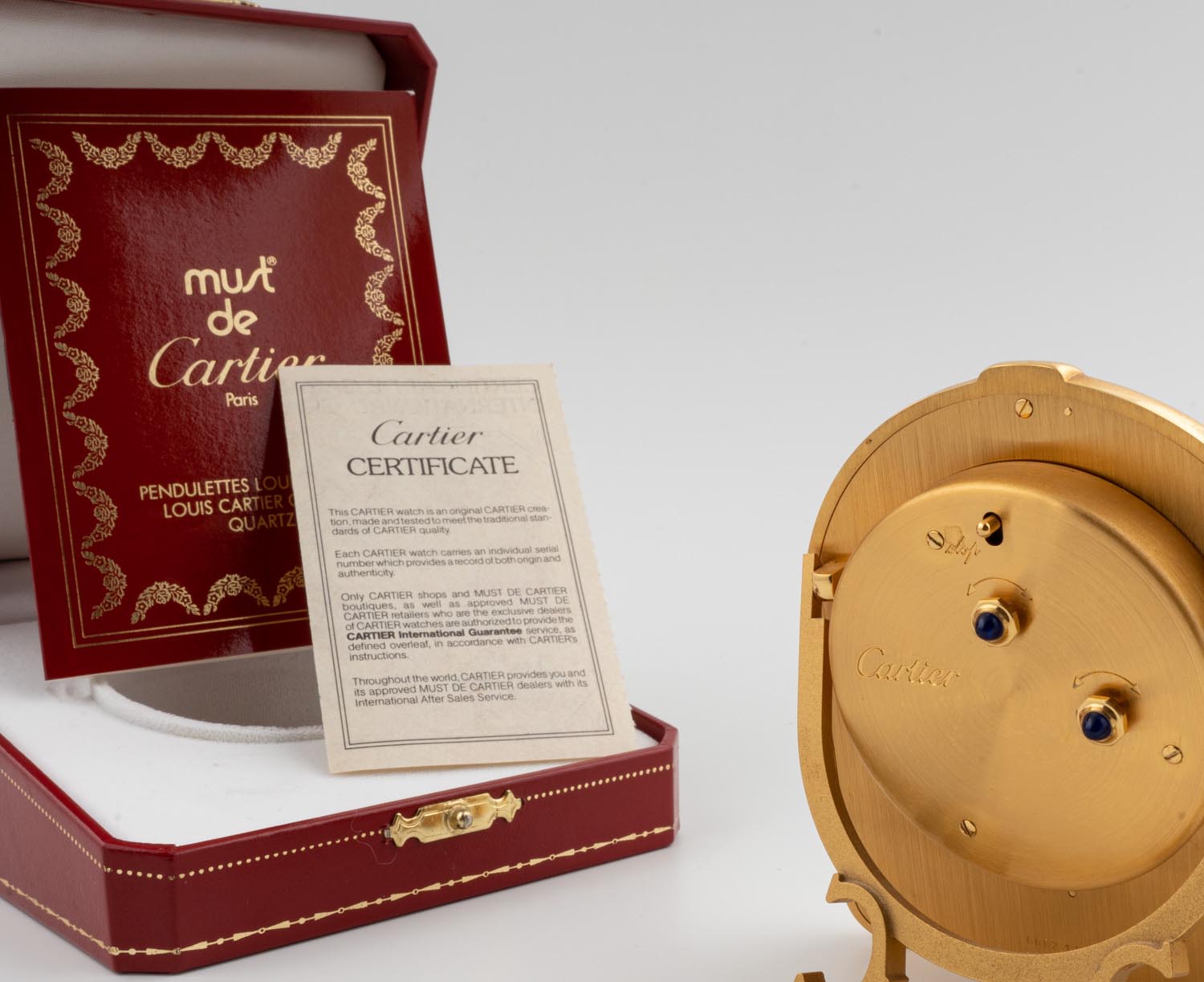 Modello pendulette, in metallo satinato e dorato, applicazioni in smalto, quadrante bianco a numeri romani, entro custodia originale, certificato con numero seriale, da revisionare