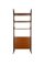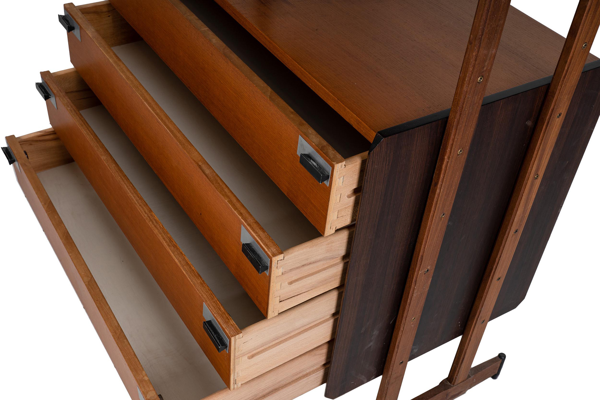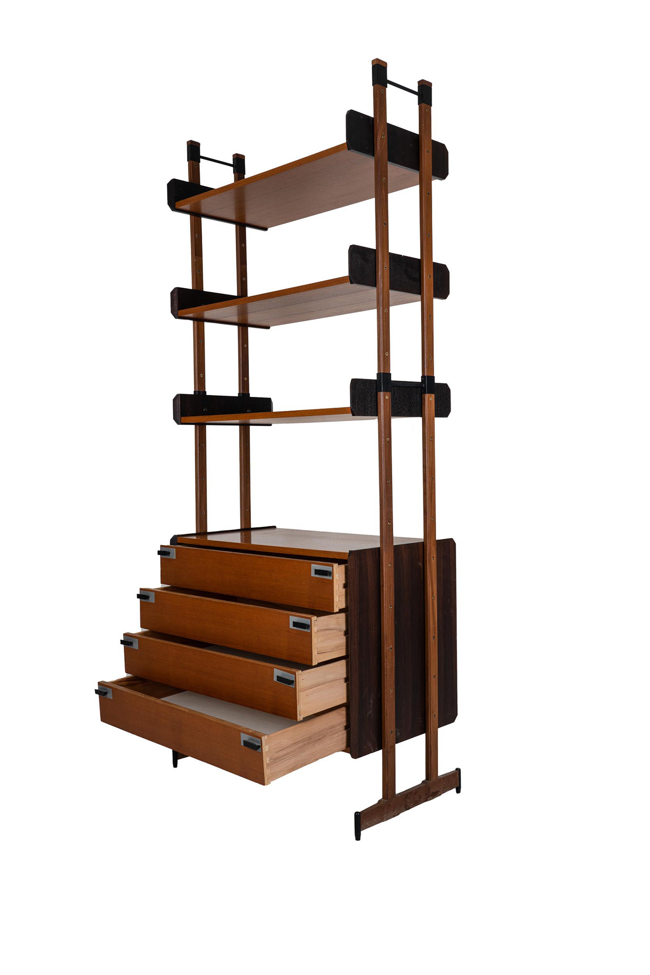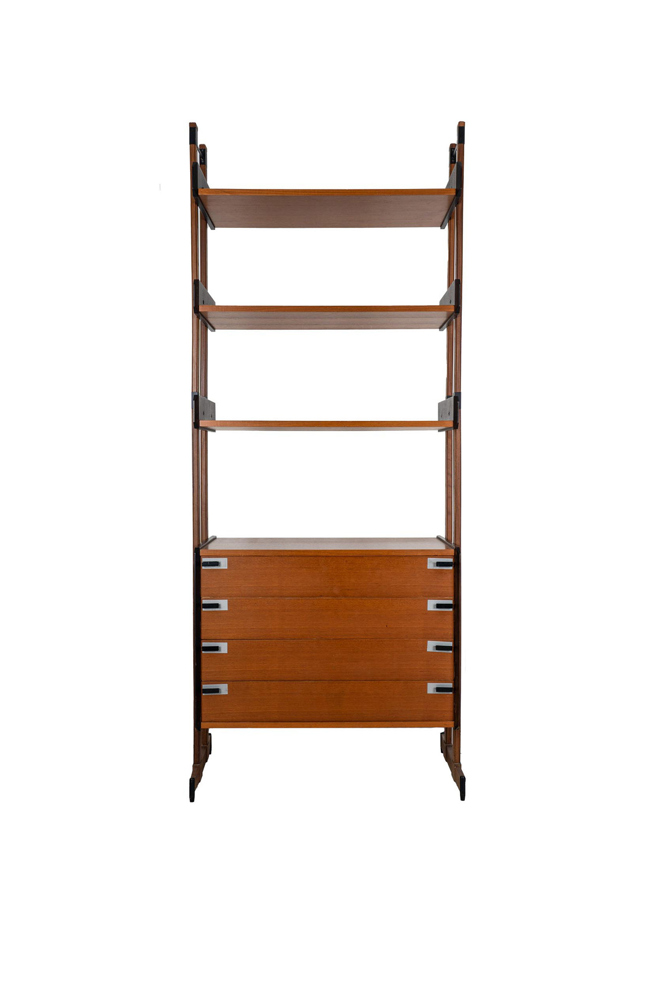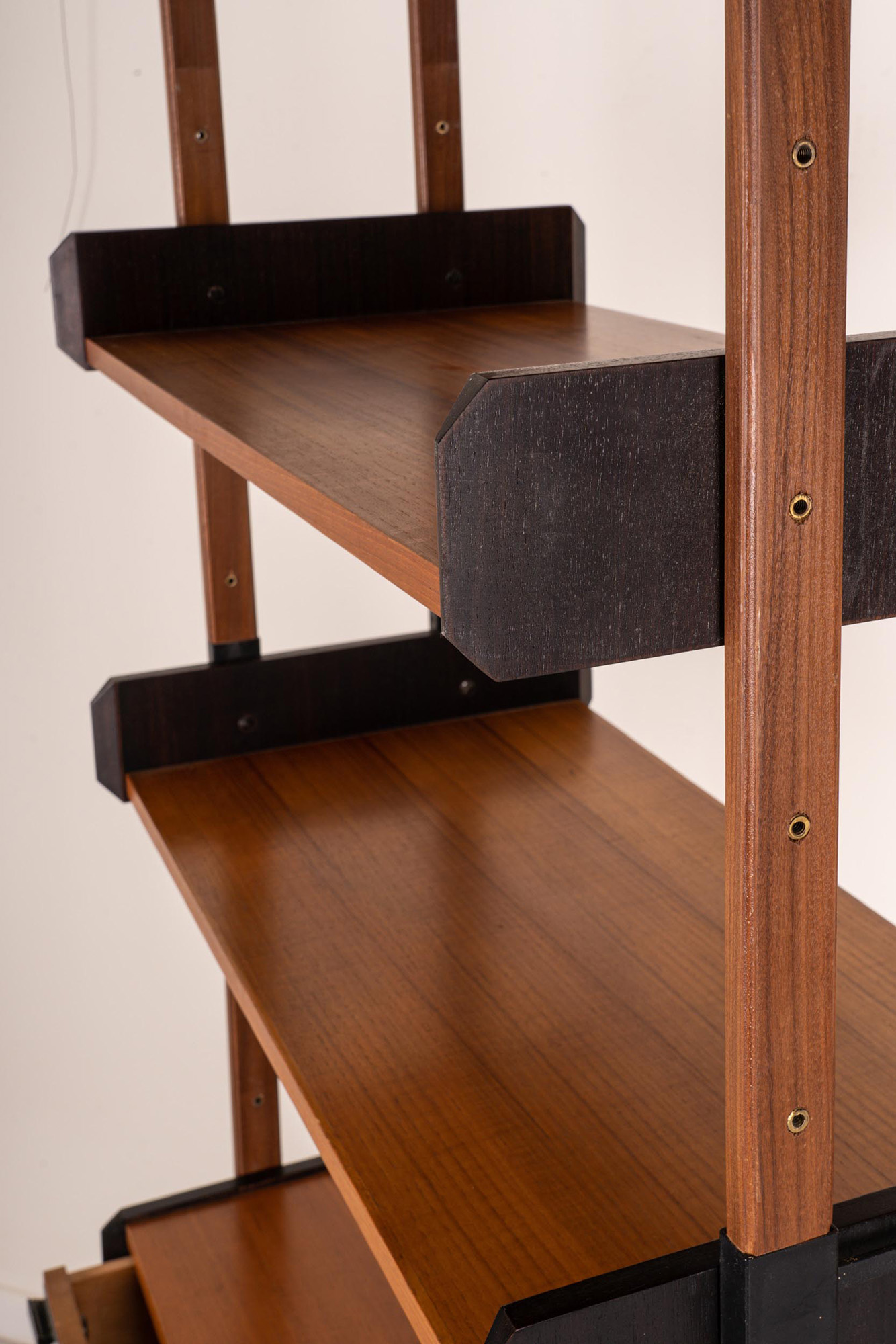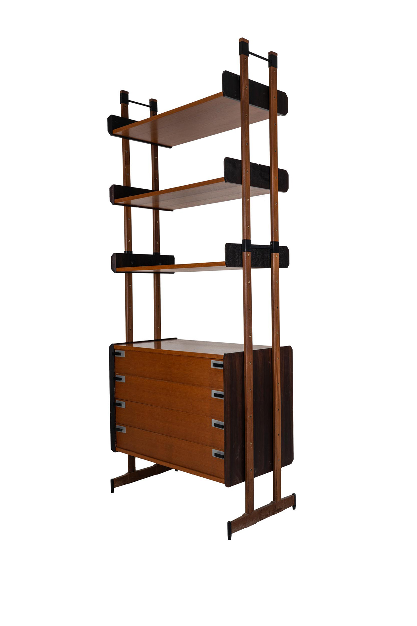 con montanti in metallo brunito, tre ripiani e cassettiera in legno