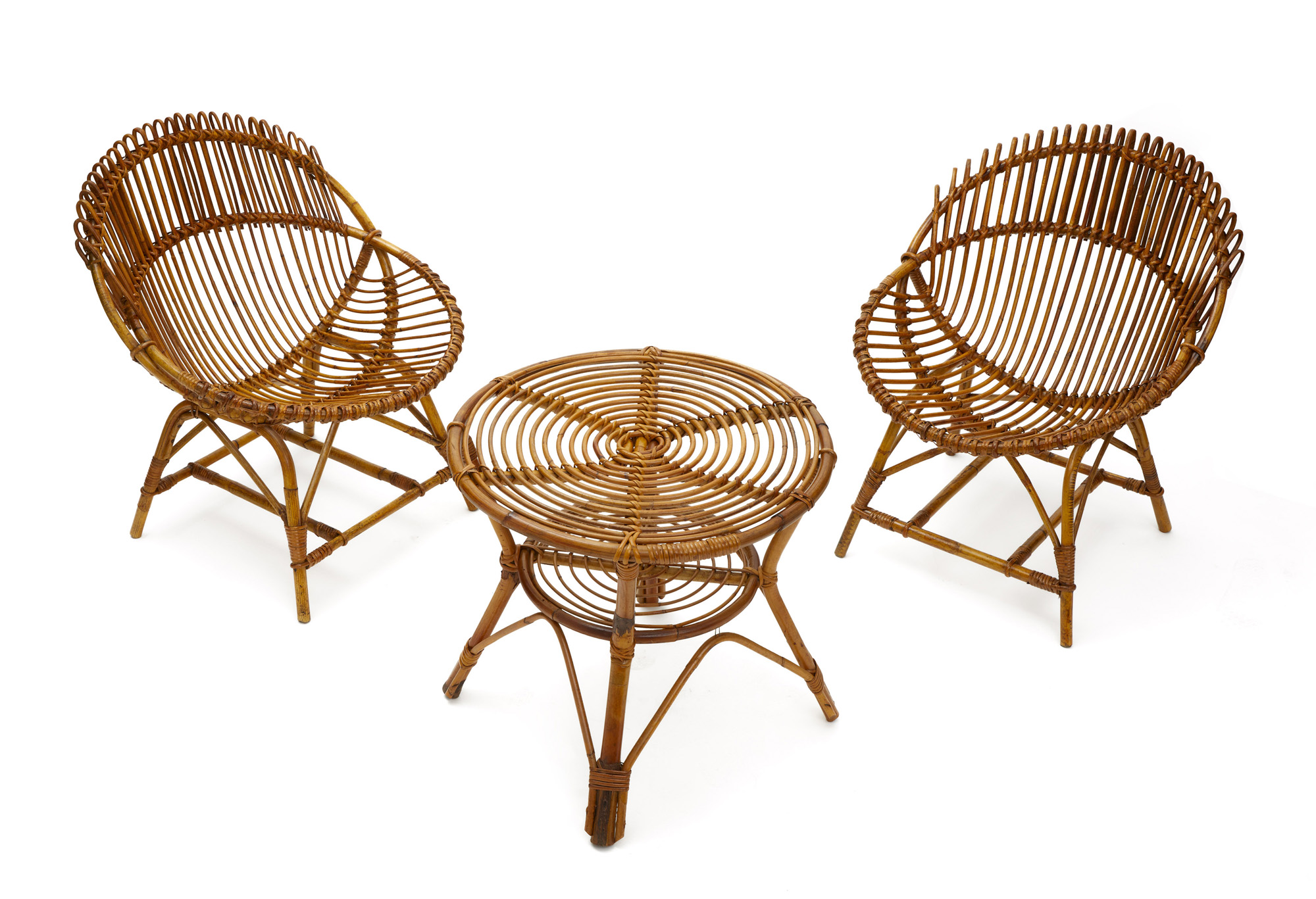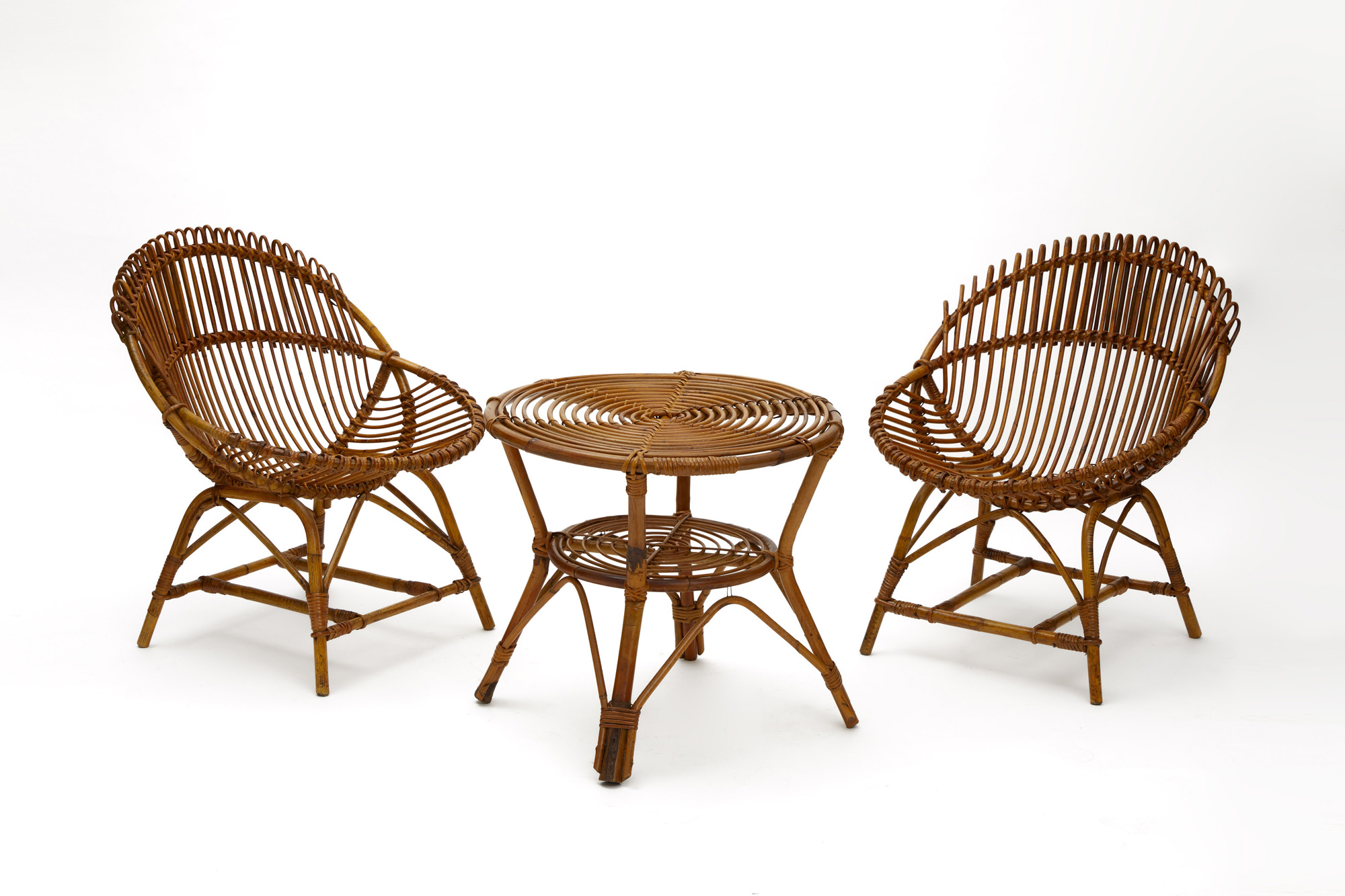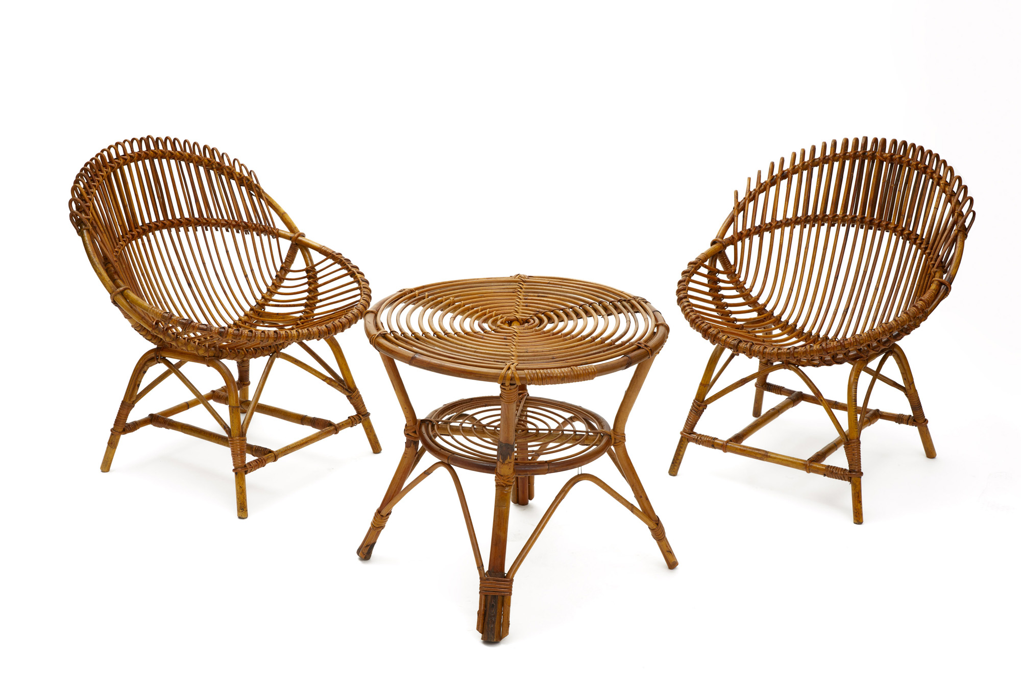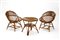 Salottino in canna d'India e giunco composto da due poltroncine e un tavolino.