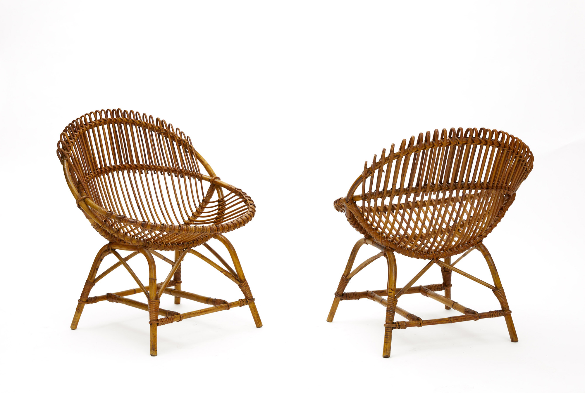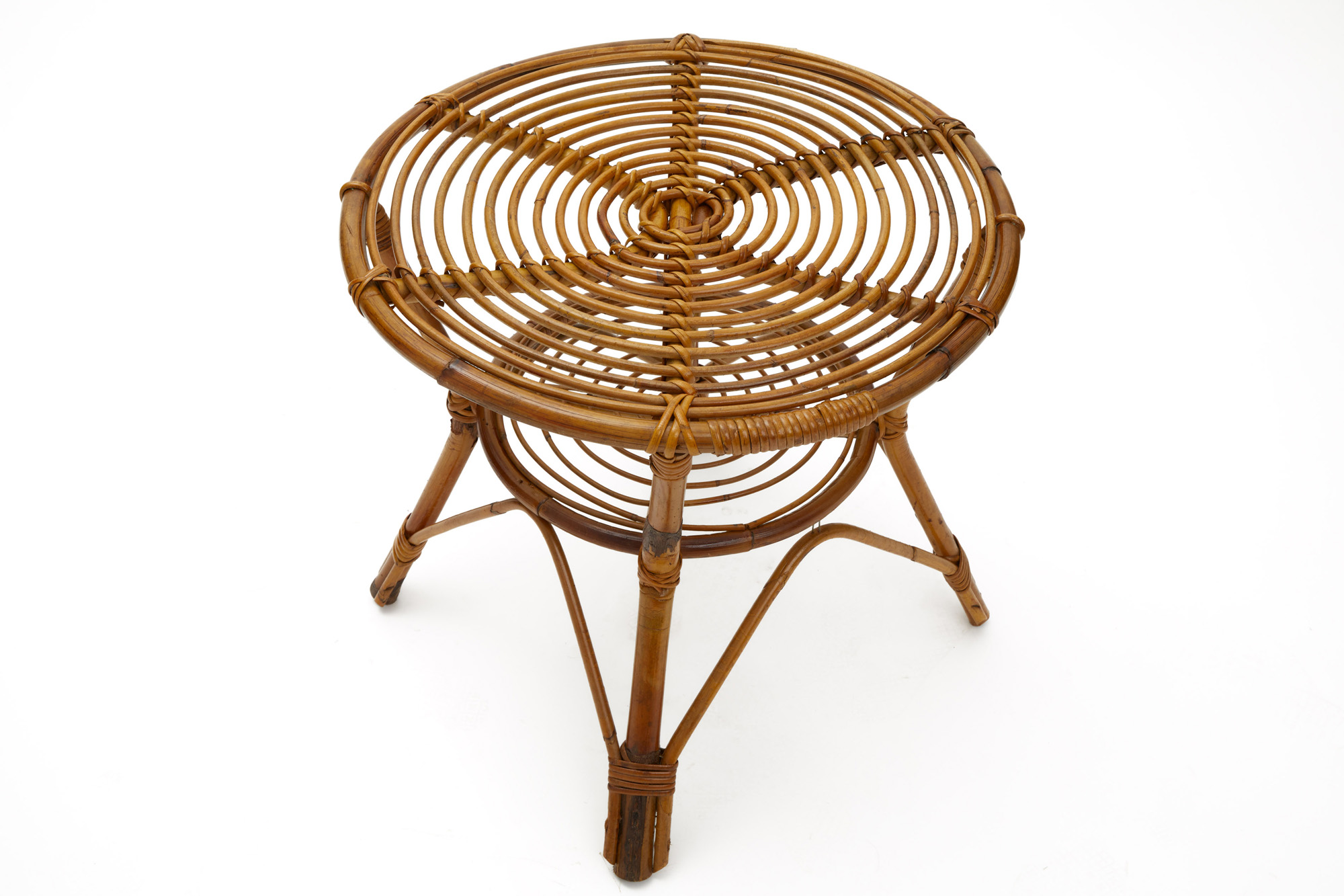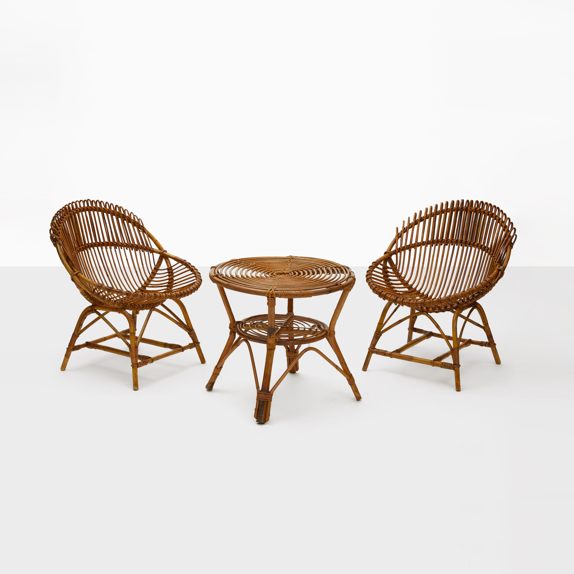 Salottino in canna d'India e giunco composto da due poltroncine e un tavolino.