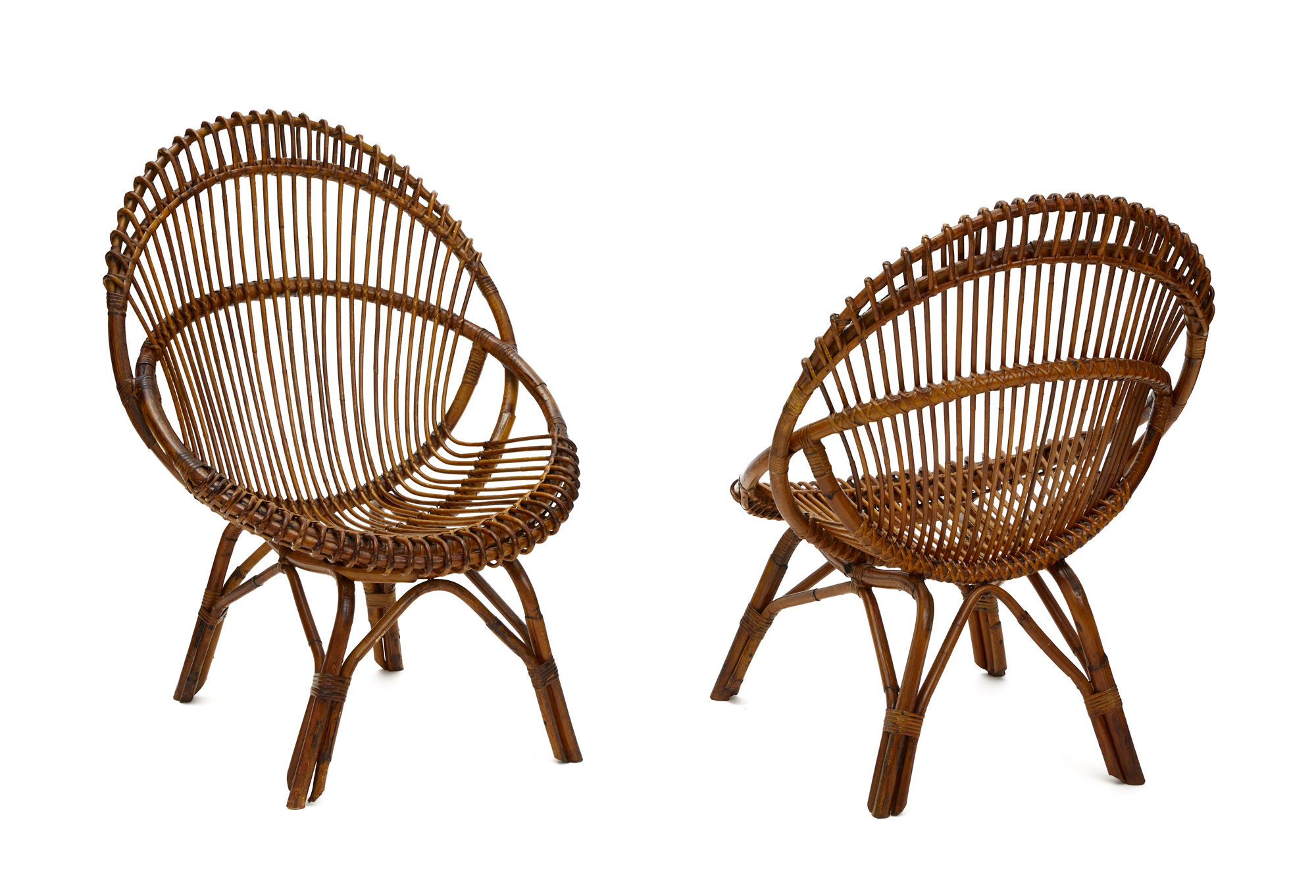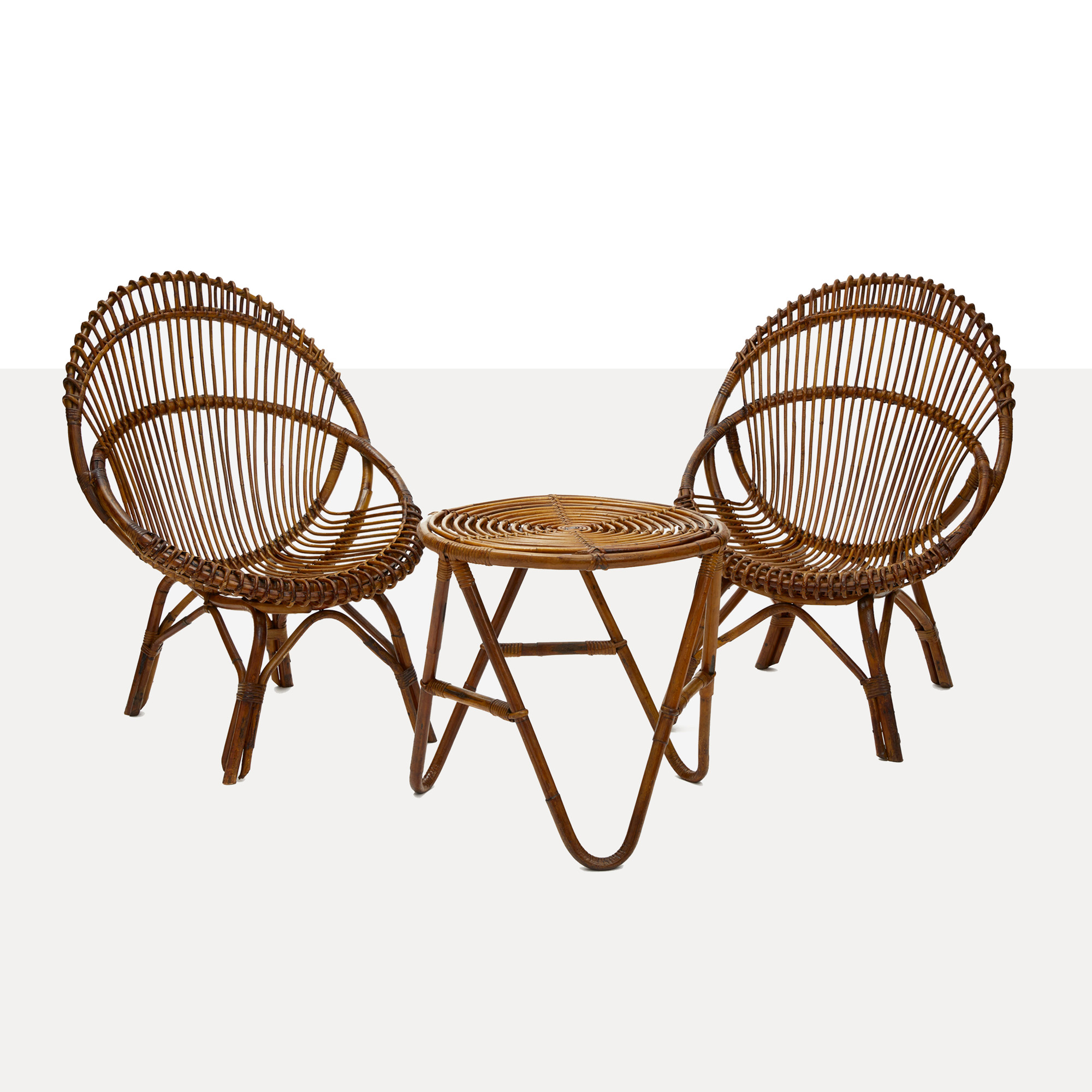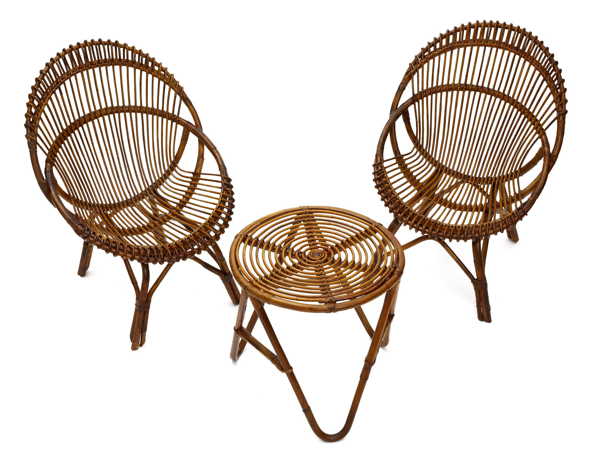 Salottino in canna d'India e giunco composto da due poltroncine e un tavolino .