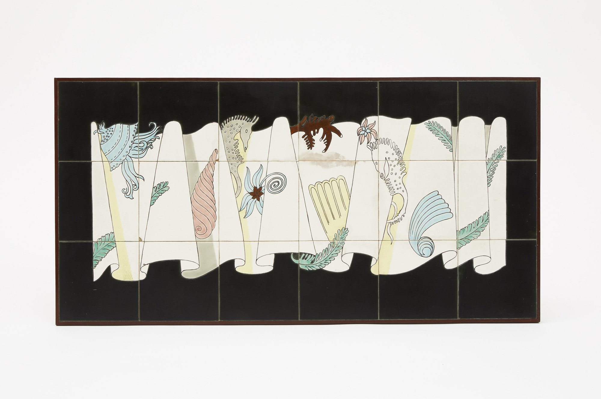 Il piano si compone di un pannello di 18 piastrelle, decoro 810, Frutti di mare su fondo nero.