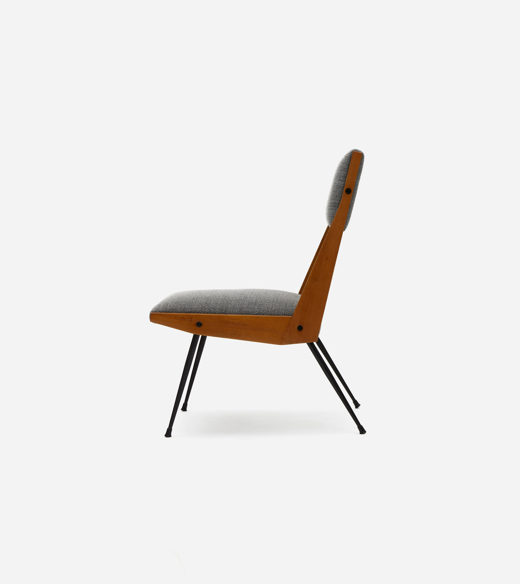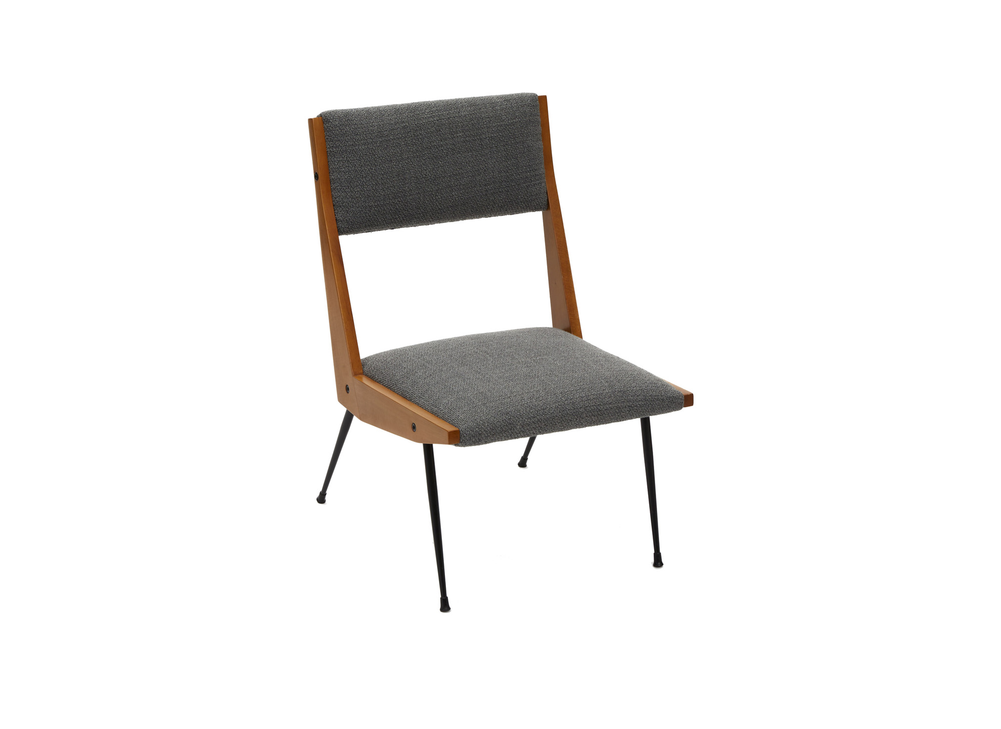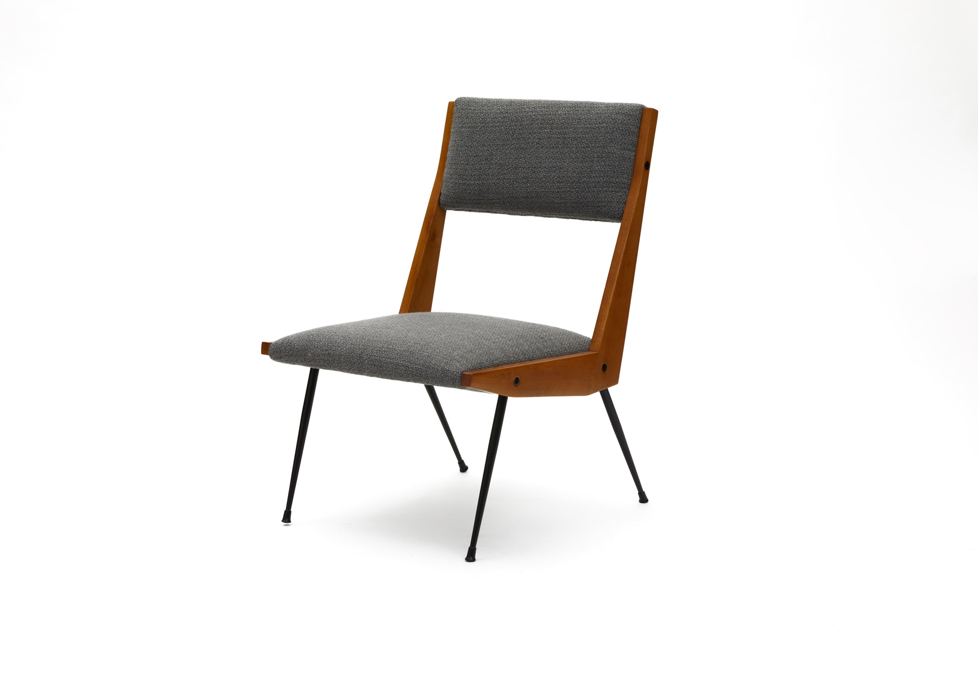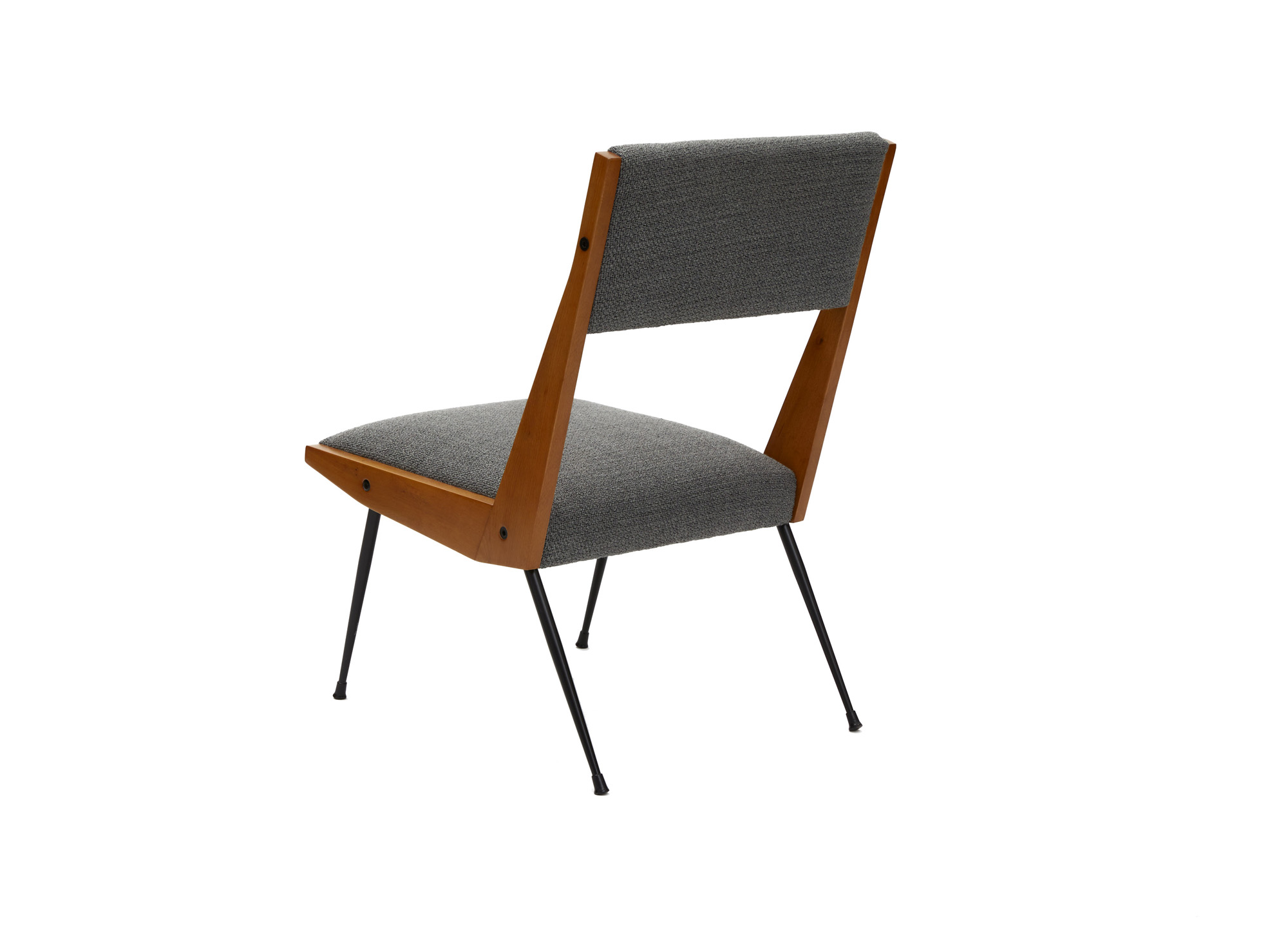 Sedia attribuita a Carlo De Carli con struttura in legno e gambe in metallo nero.