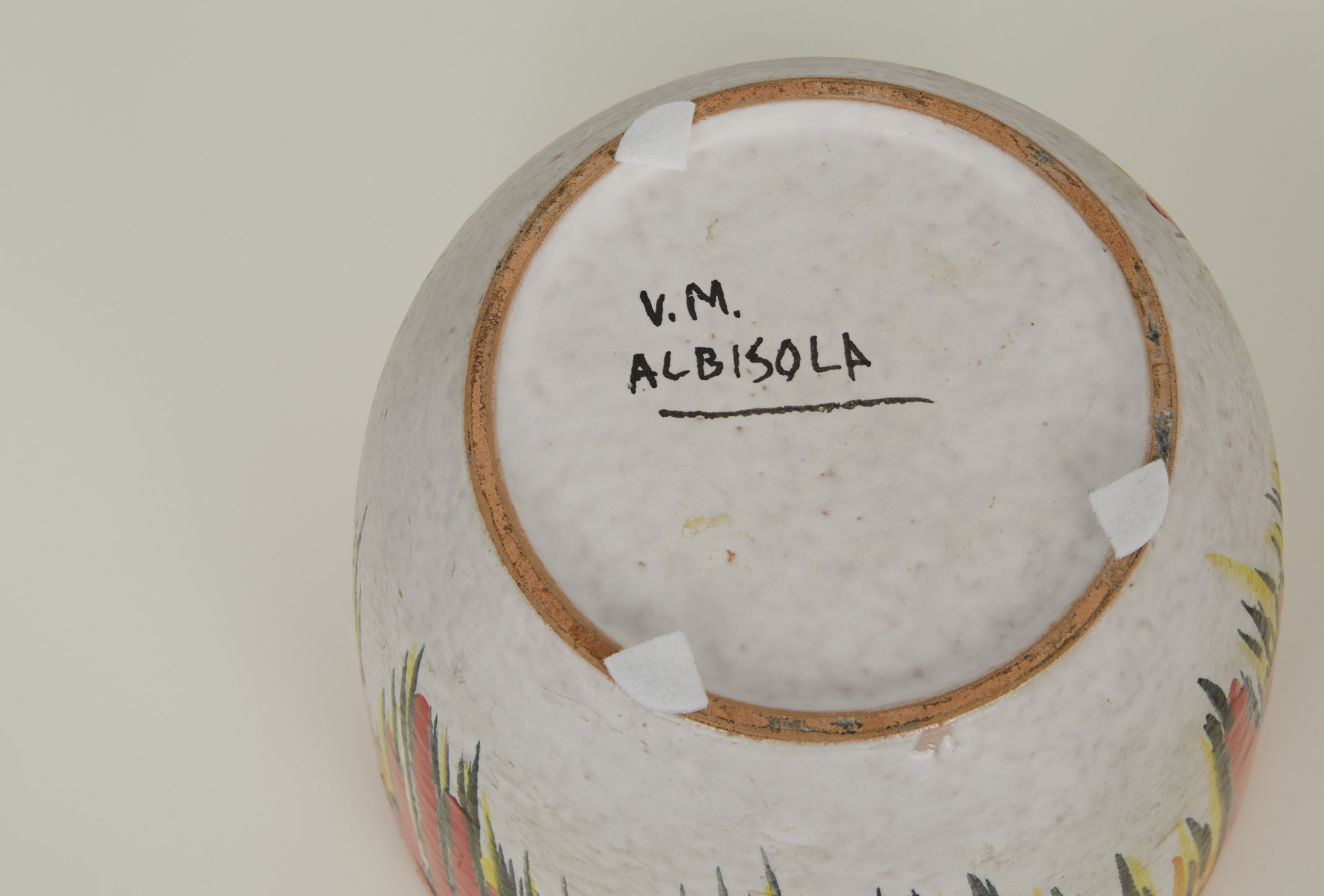 vaso in ceramica bianca con decori nei toni del giallo ed arancio, firmato V.M. Albisola