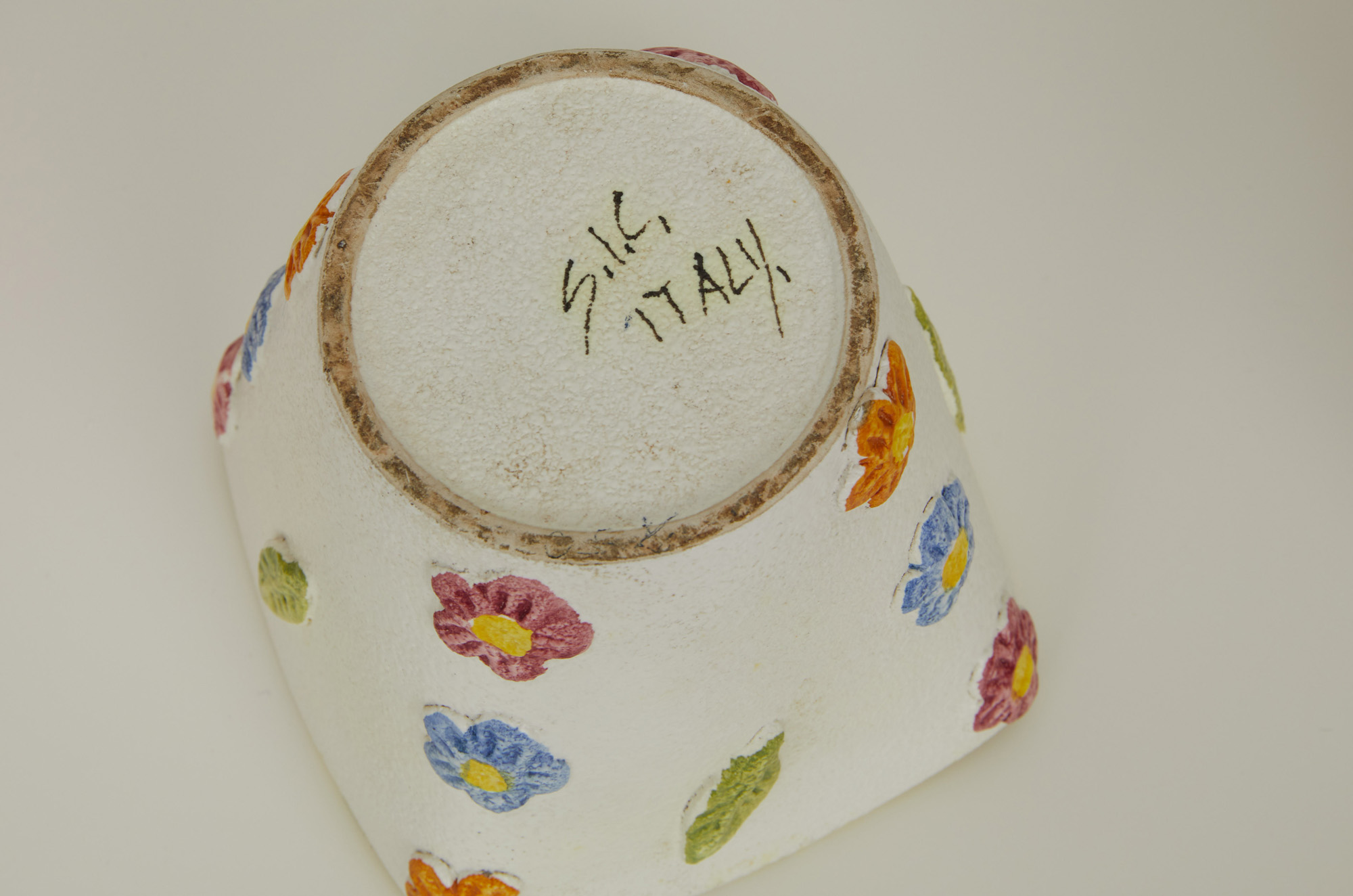 piccolo vaso in ceramica bianca con decori floreali policromi, firmato S.I.C. Italia (H 10 cm);