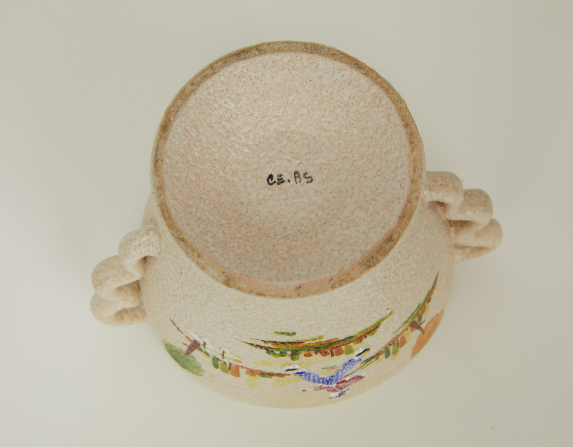 piccolo vaso in ceramica color sabbia con decori policromi raffiguranti figure e paesaggi, firmato CE.AS. (H 16 cm).