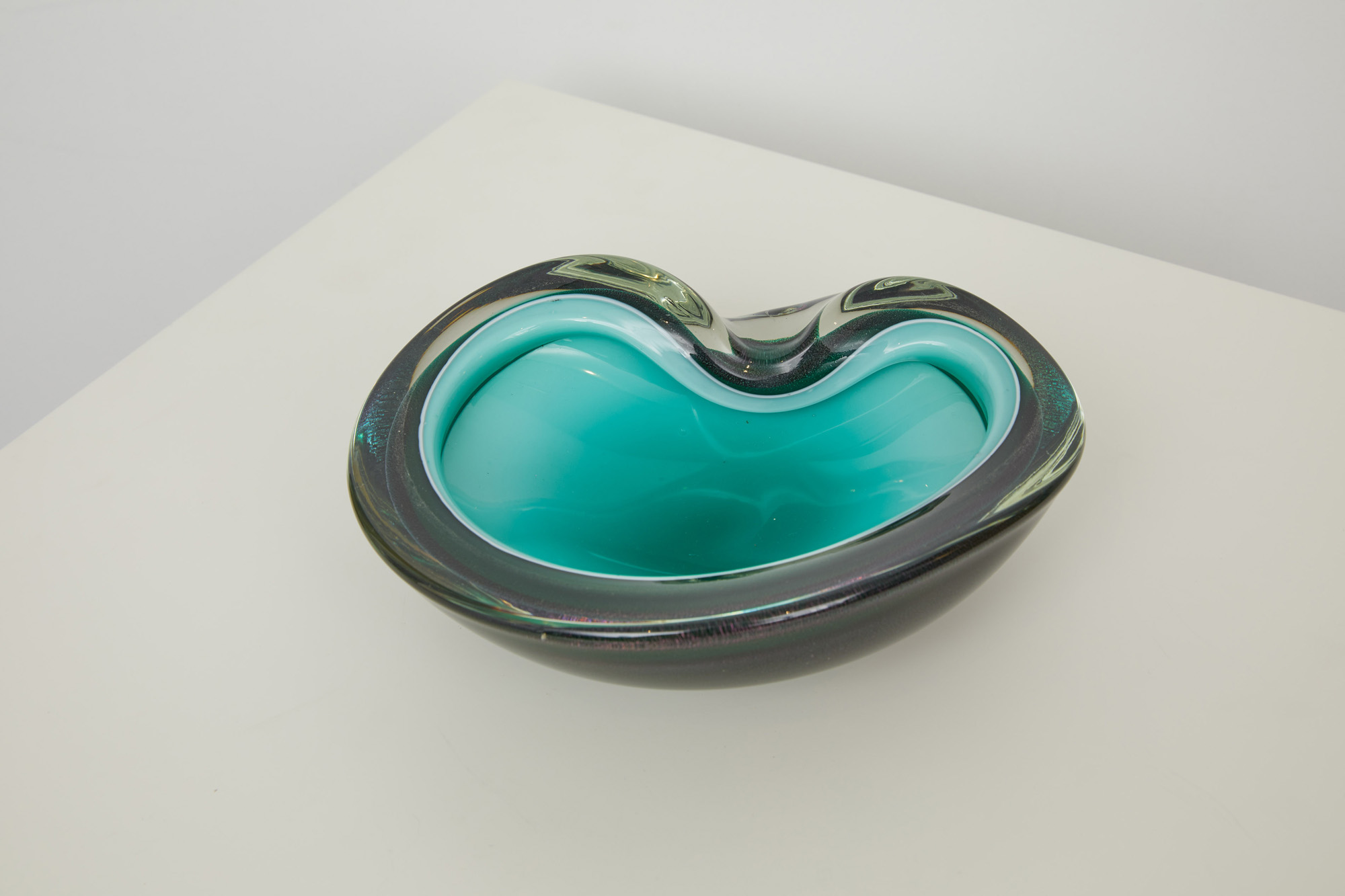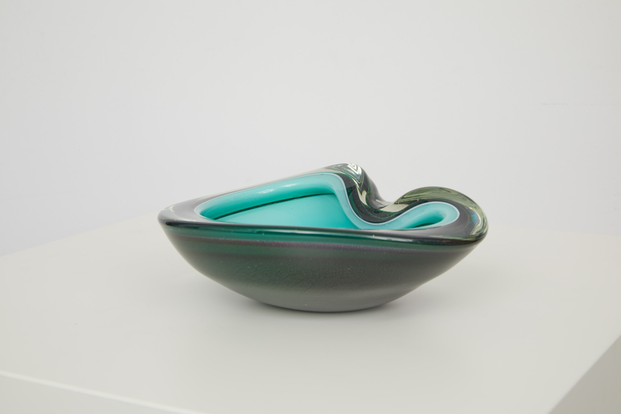 Svuotatasche in vetro di Murano sommerso incamiciato nei toni del verde acqua.