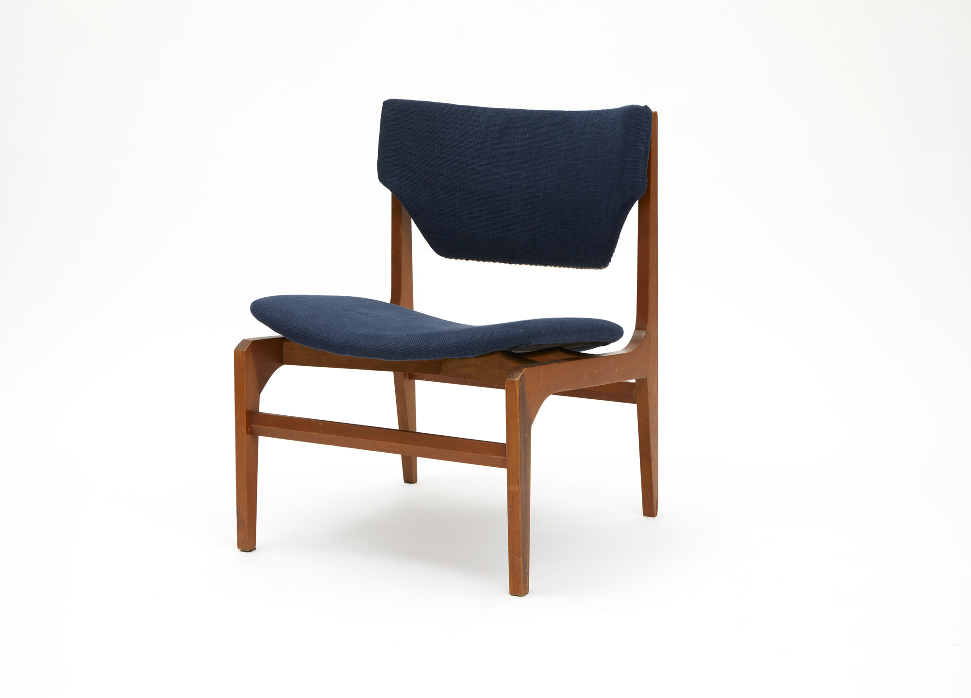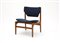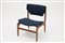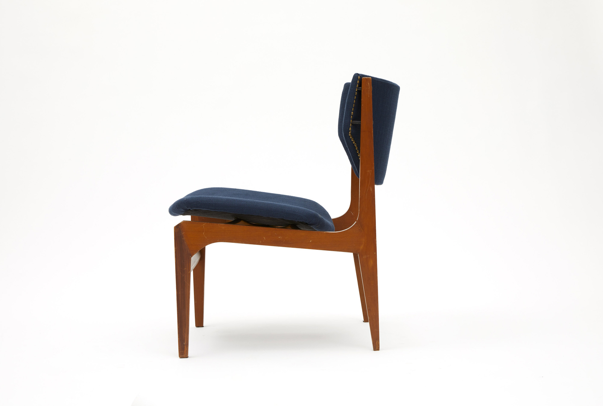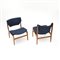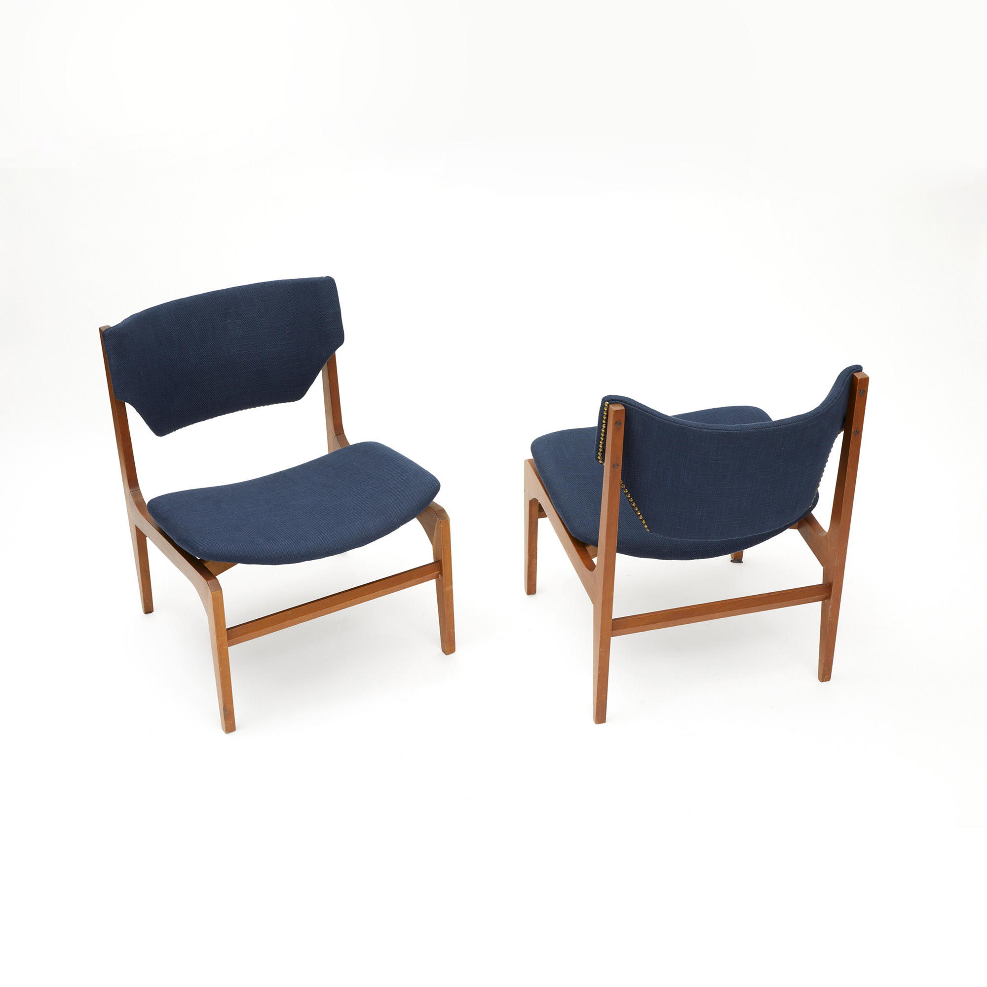 Coppia di poltroncine con struttura in legno, seduta e schienale imbottiti e rivestiti in tessuto blu.