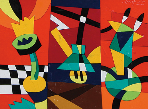 UGO NESPOLO Mosso Santa Maria (Bi) 29/08/1941 Red interior acrilici su legno intarsiato cm. 18x24, firma in alto a destra, titolo, etichetta dell'artista in stoffa ed etichetta del Centro Arte La Tesoriera (TO) al retro, dichiarazione d'autenticità dell'artista su foto.
