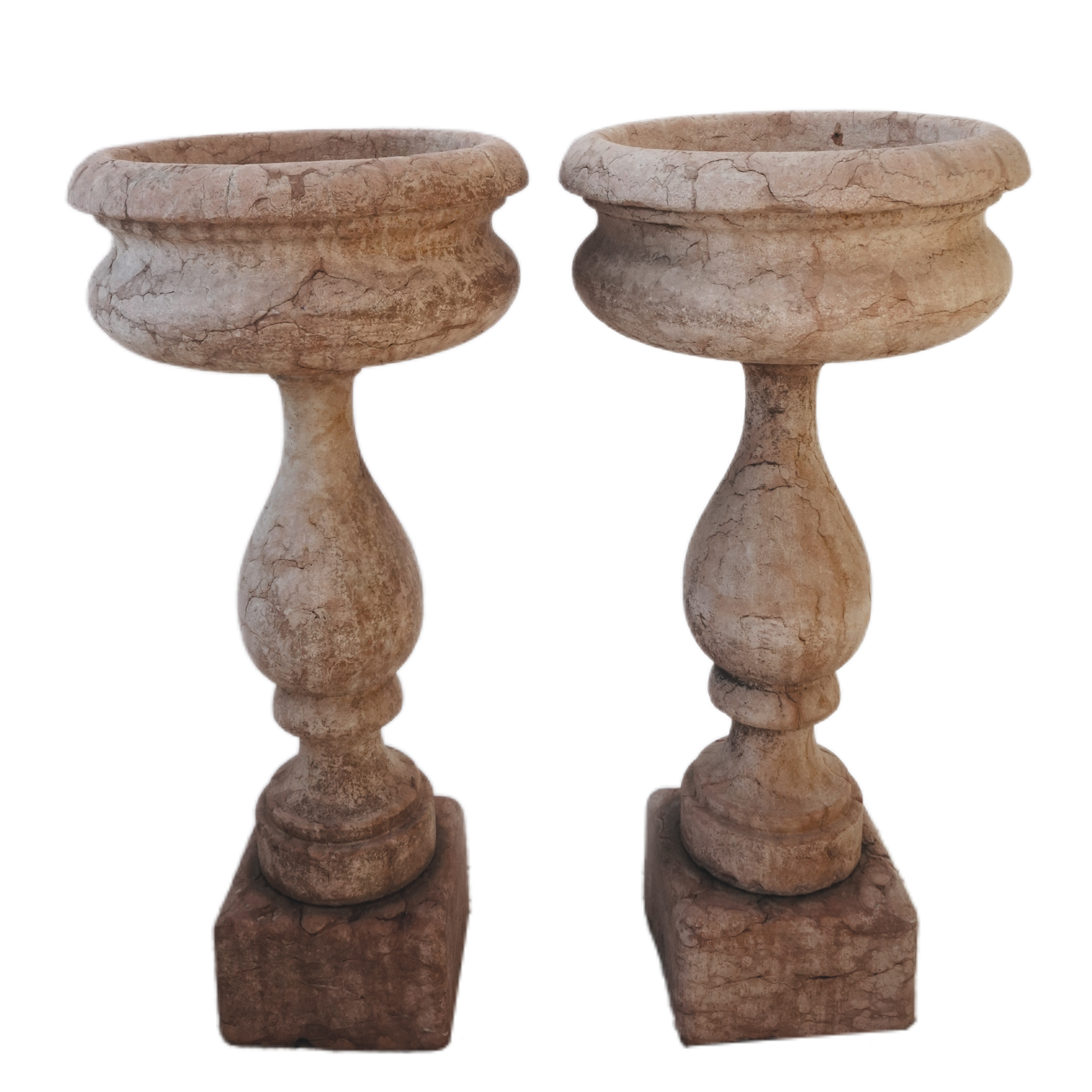 Coppia di acquasantiere in marmo rosso di Verona. Vasca circolare su montante a balaustro poggiante su base quadrata, cm. 117x54.