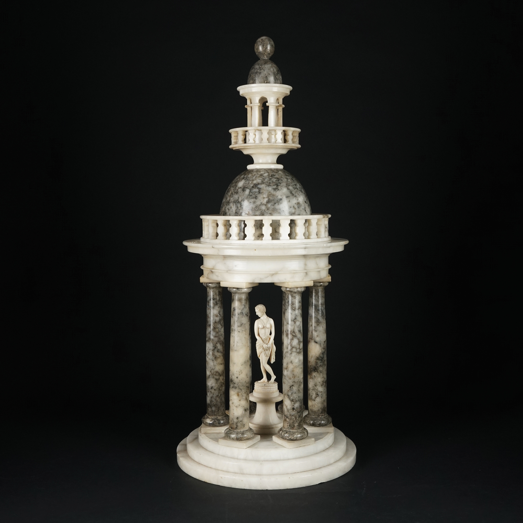 Tempietto di forma circolare in alabastro: sei colonne a fusto liscio sostengono una trabeazione modanata su cui poggia una cupola completata da ringhierine traforate; al centro una figura muliebre stante in avorio.