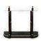 Console in mogano; montanti anteriori lineari abbelliti da semicolonne ebanizzate con capitelli in ottone dorato e terminali a pigna; base a mezzaluna con piano in vetro nero decorata da fregio a greca dorato; piano in vetro, cm. 118x136x30.