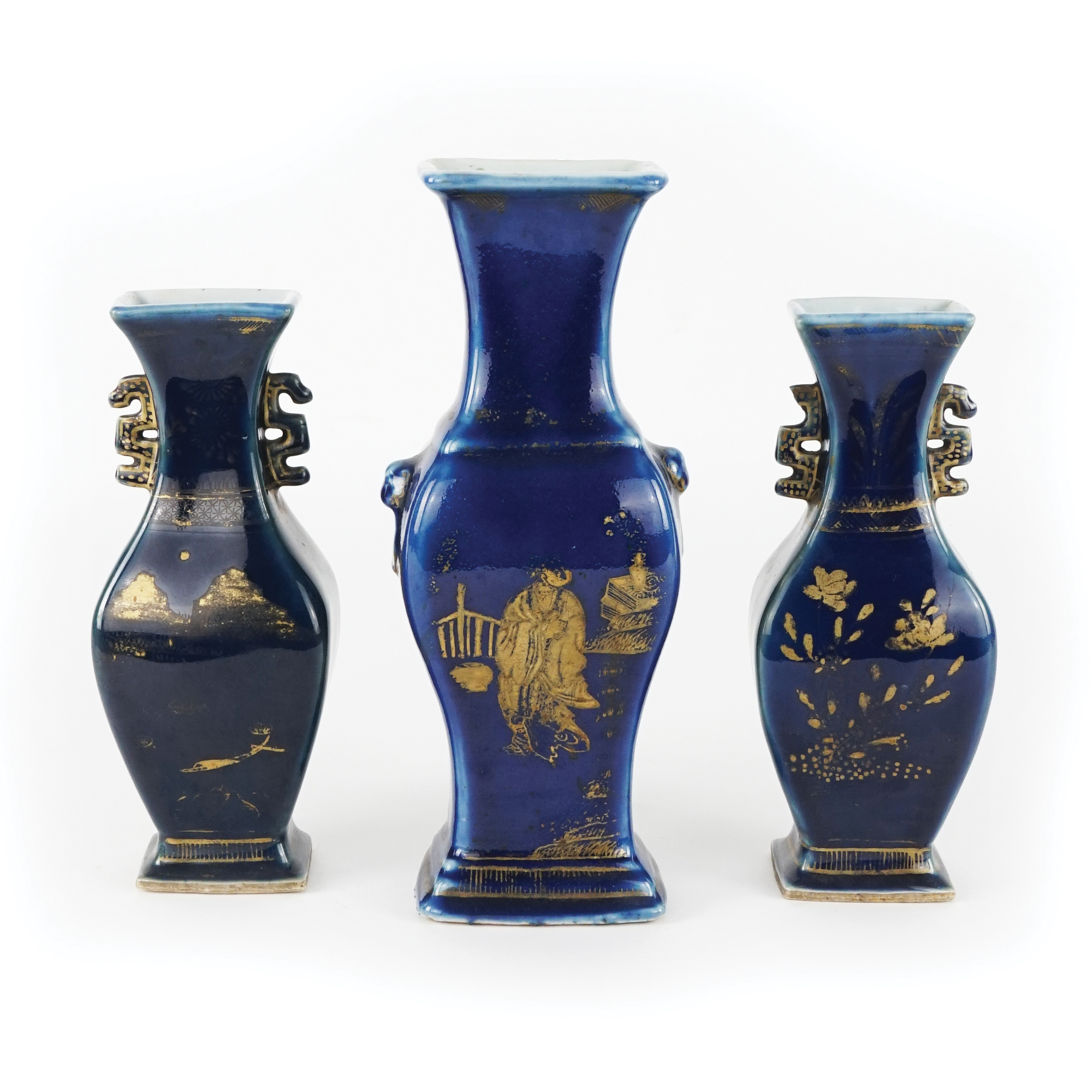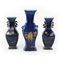 Tre vasi in porcellana blu e dorata, dipinti a raffigurare paesaggi orientali e figura di saggio.