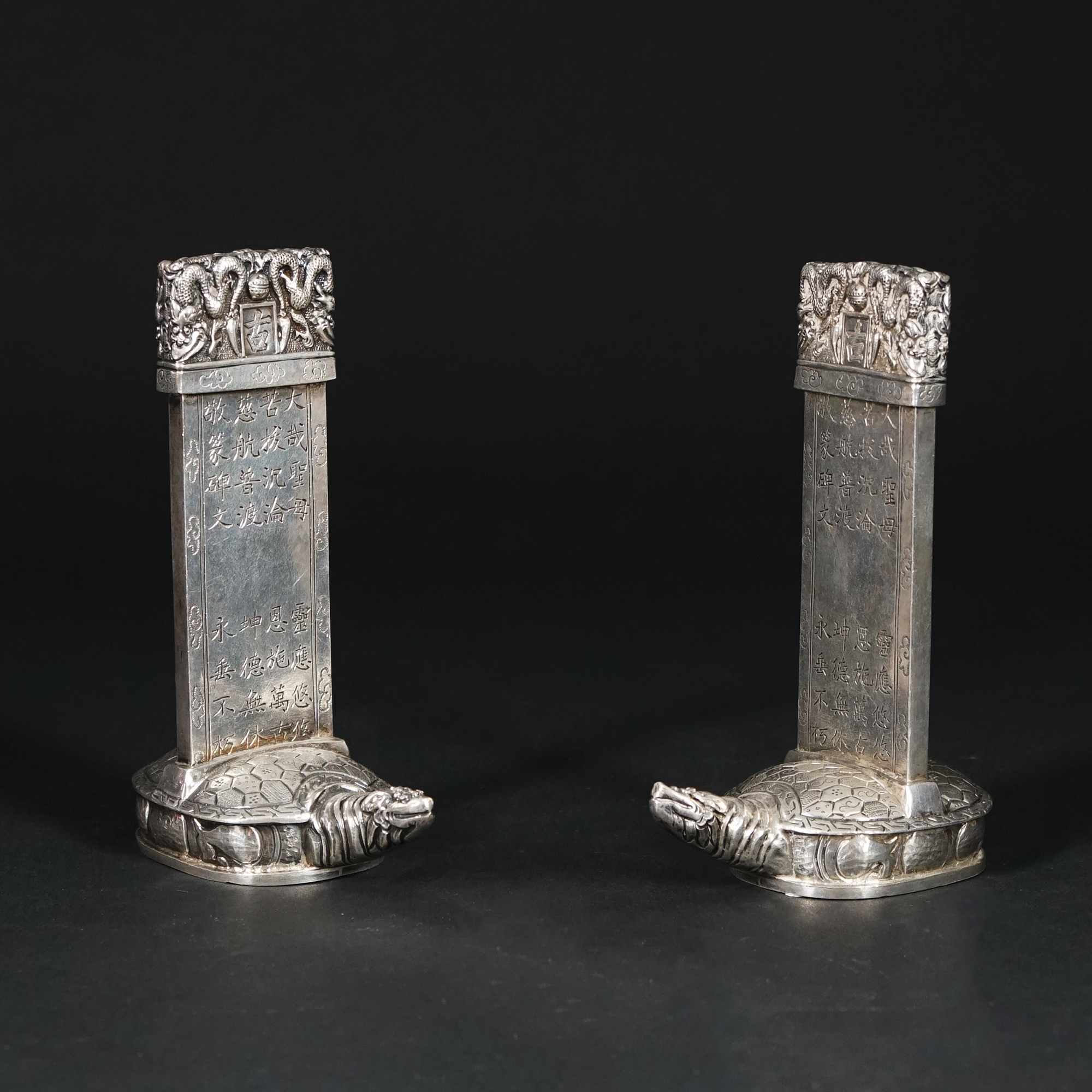Coppia di spargi incenso in argento. Base cesellata in forma di tartaruga che sostiene una stele con incisi simboli e lettere dell'idioma cinese.