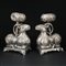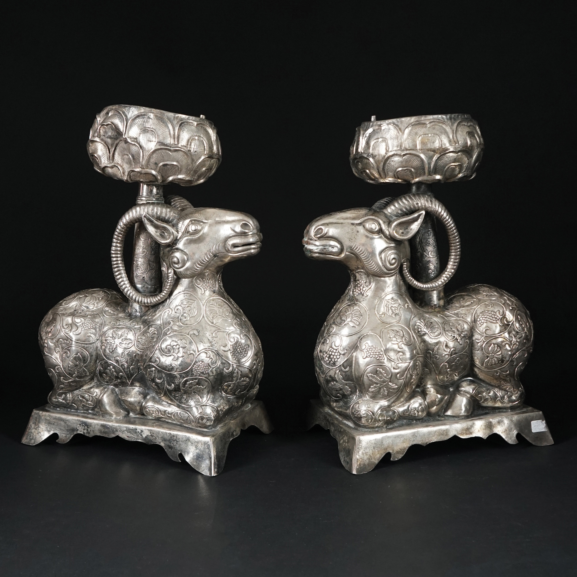 Coppia di incensieri in argento lavorati a guisa di arieti interamente cesellati sul corpo a motivi fogliati che sostengono una torcia anch'essa sbalzata e cesellata.