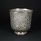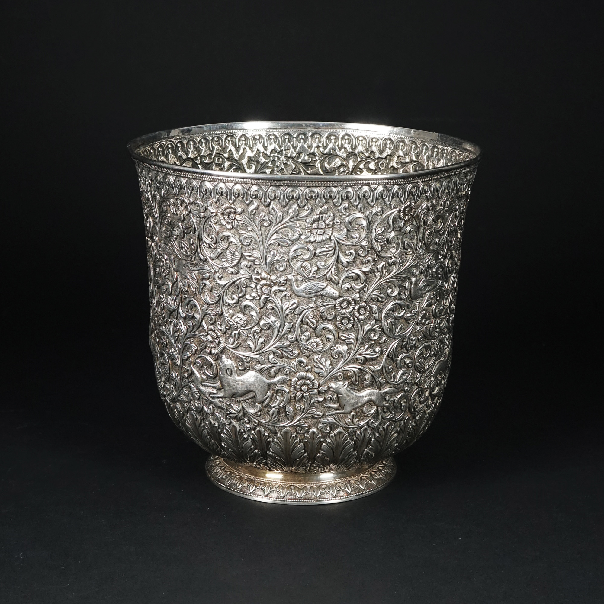 Vaso in argento a superficie sbalzata a raffigurare una scena di caccia alla tigre tra fitti motivi vegetali; piede circolare.