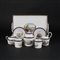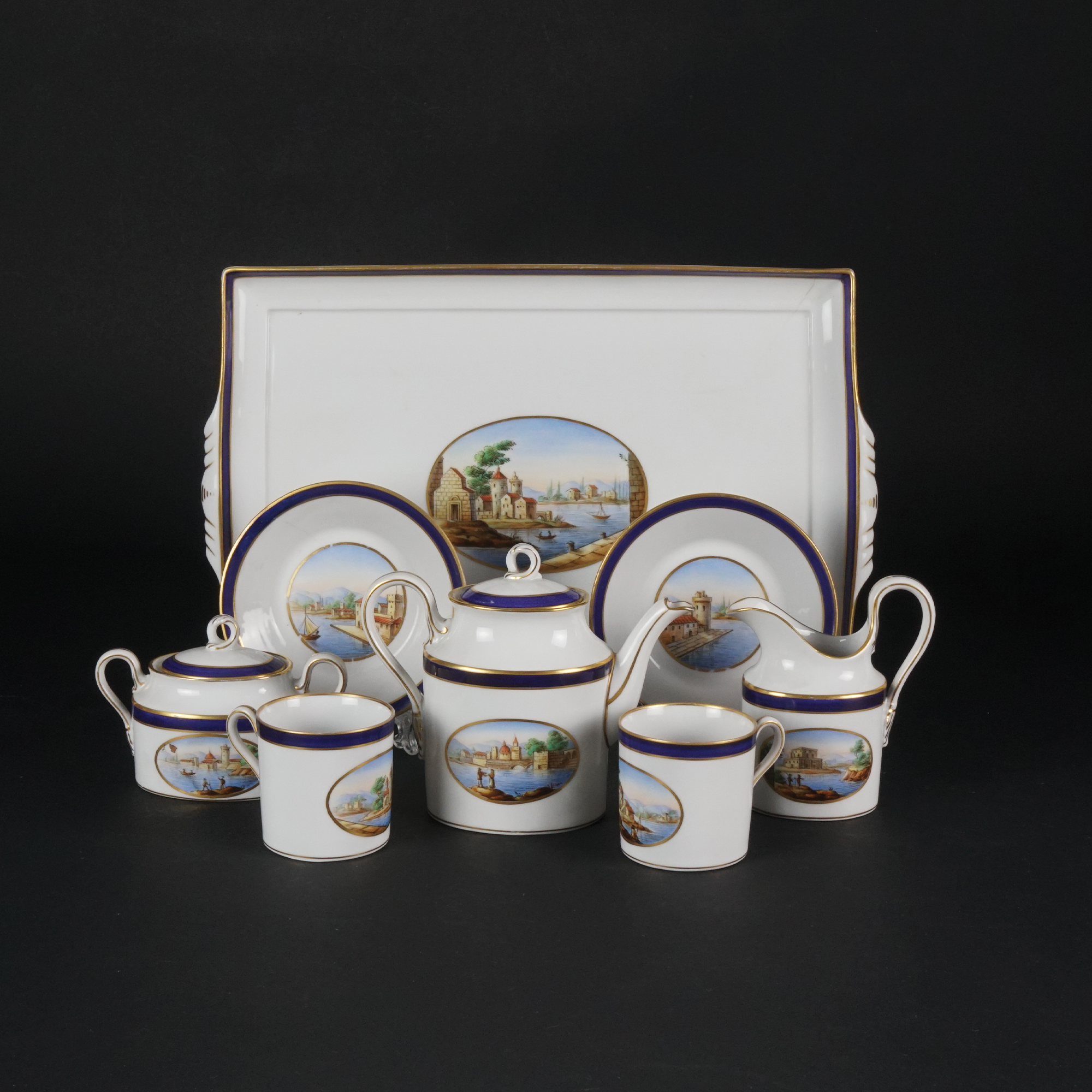 Servizio tete à tete in porcellana bianca, blu e dorata dipinto a riserve policrome con vedute fluviali con imbarcazioni e costruzioni. Si compone di una caffettiera, una lattiera, una zuccheriera con coperchio, due tazze da caffè con relativo piatto e un vassoio rettangolare.