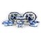 Due zuppiere, una salsiera, un'alzata e due vassoi in terraglia bianca e blu decorata a motivi floreali e a paesini orientali.