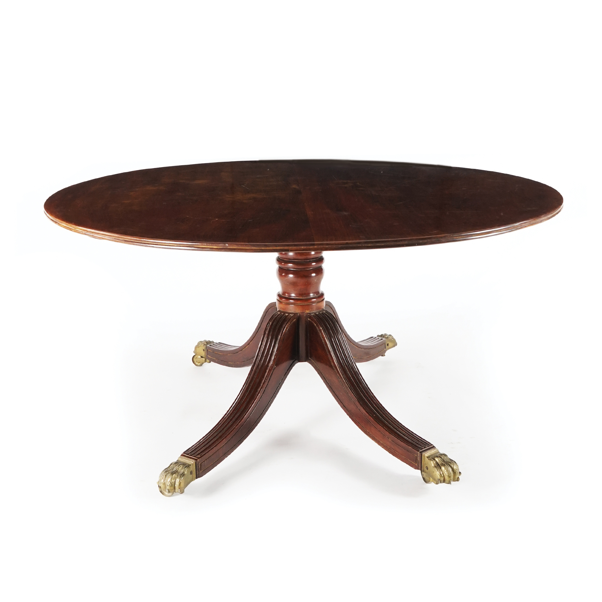 Tavolo di mogano con piano circolare sostenuto da un montante centrale tornito poggiante su quattro gambe scanalate con piedi muniti di scarpette di bronzo dorato e cesellato a zampa ferina.