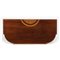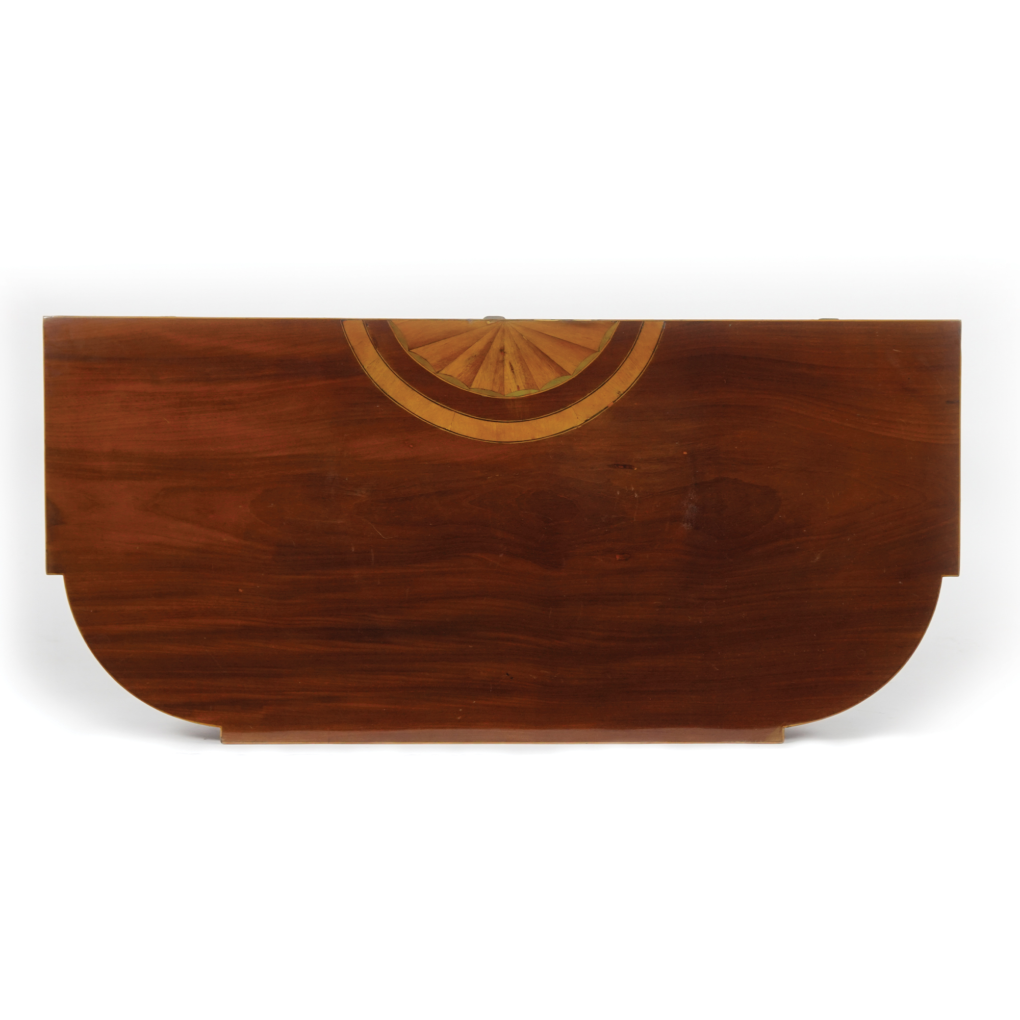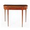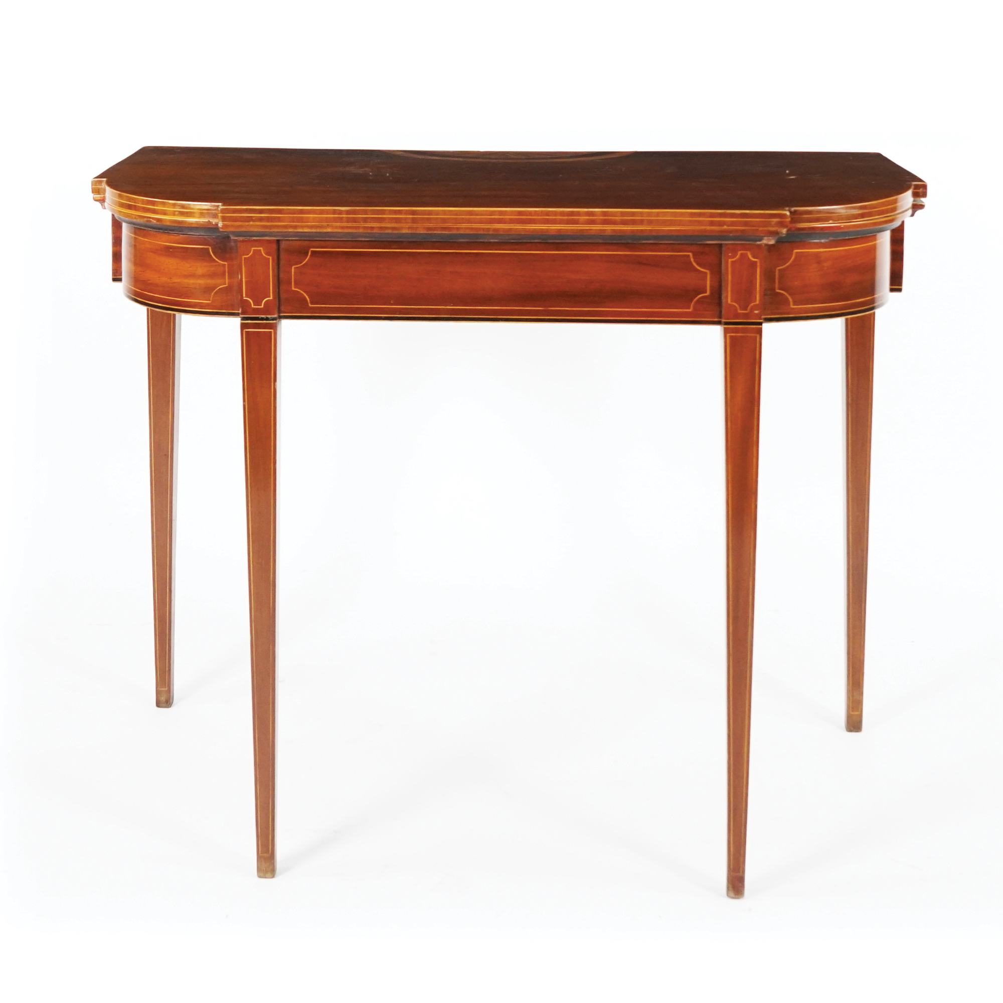 Tavolino da gioco in mogano filettato e intarsiato in acero; piano rettangolare dal profilo arrotondato apribile a libro: un motivo a ventaglio arricchisce la superficie lignea. Alte gambe a obelisco.