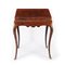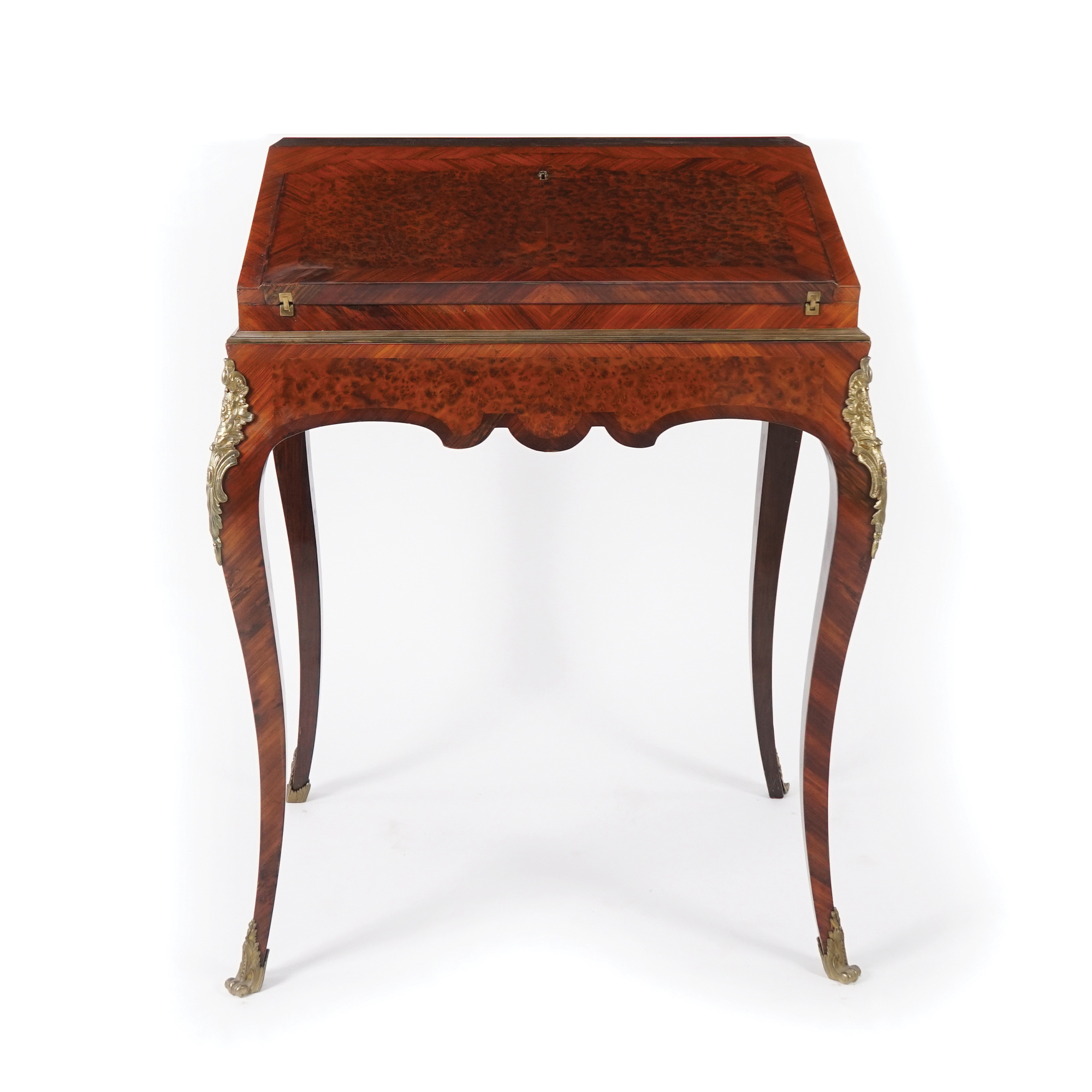 Bureau dos d'ane impiallacciato in legno di varie essenze in parte disposto a cartelle spinate; fronte con calatoia celante all'interno due tiretti allineati e una tablette scorrevole dall'apertura della quale si svela un vano segreto. Gambe en cabriole.