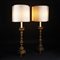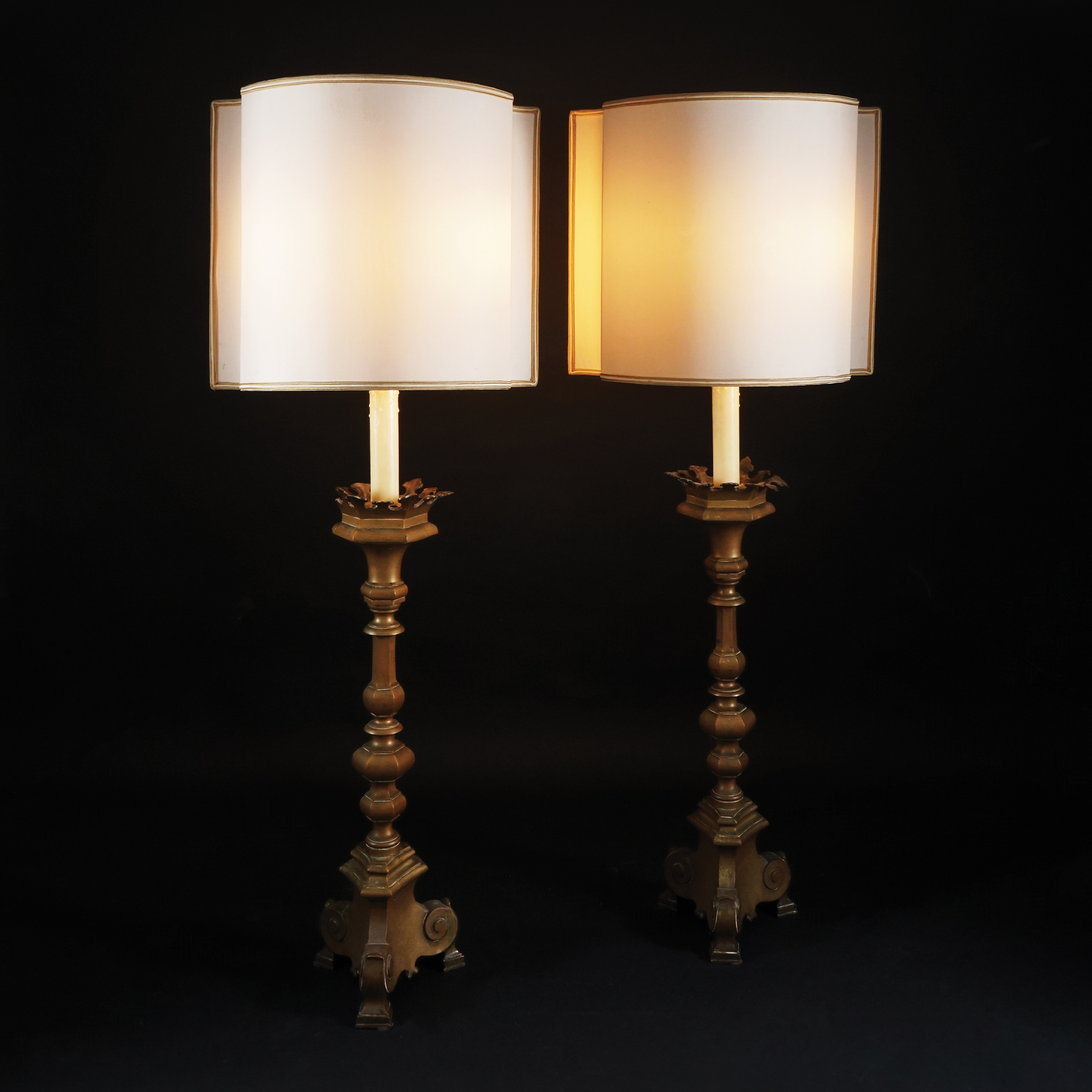 Coppia di torceri in bronzo patinato con stelo e piattello a corona esagonali; base triangolare; montati a lume con annessi paralumi, i torceri h. cm. 80