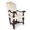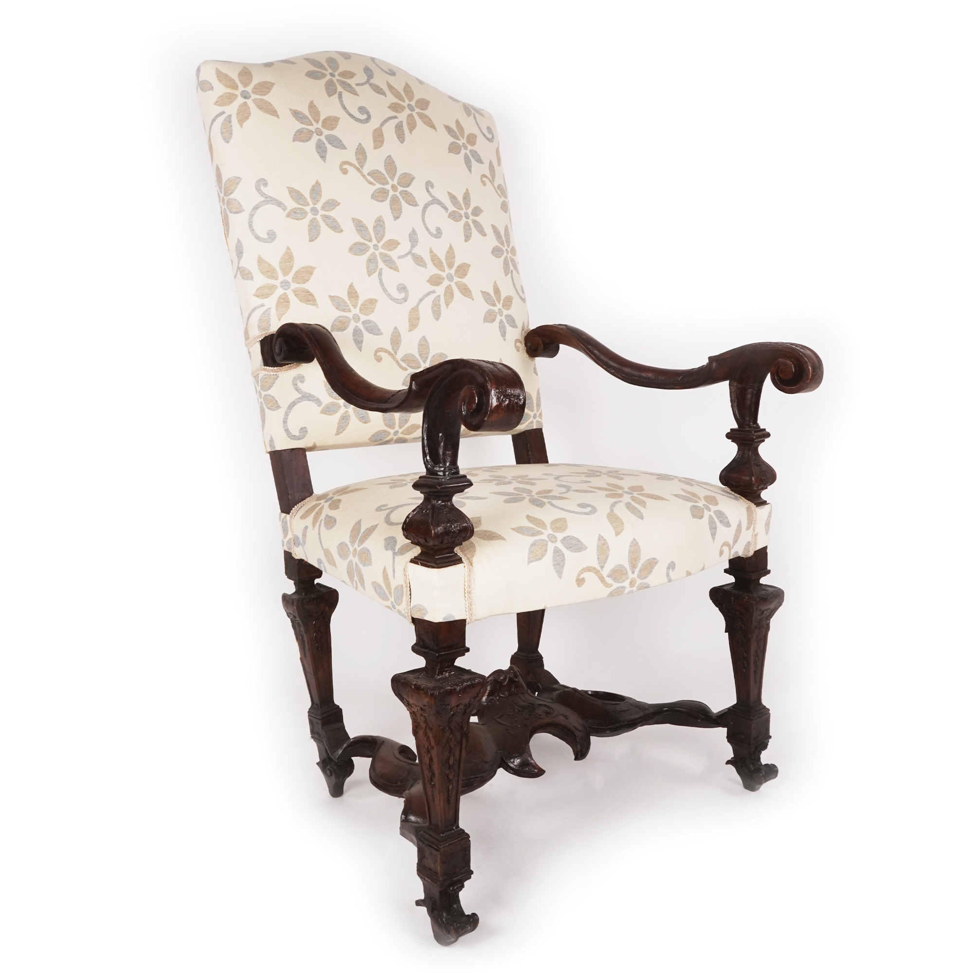 Poltrona di noce rivestita di stoffa a fiori. Dossello superiormente arcuato; braccioli desinenti in un ricciolo poggianti su montanti a balaustro; gambe a obelisco riunite da traversa sagomata.