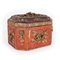 Scatola di forma ottagonale in legno laccato rosso e pastiglia dorata, decorata in rilievo a motivi floreali.