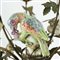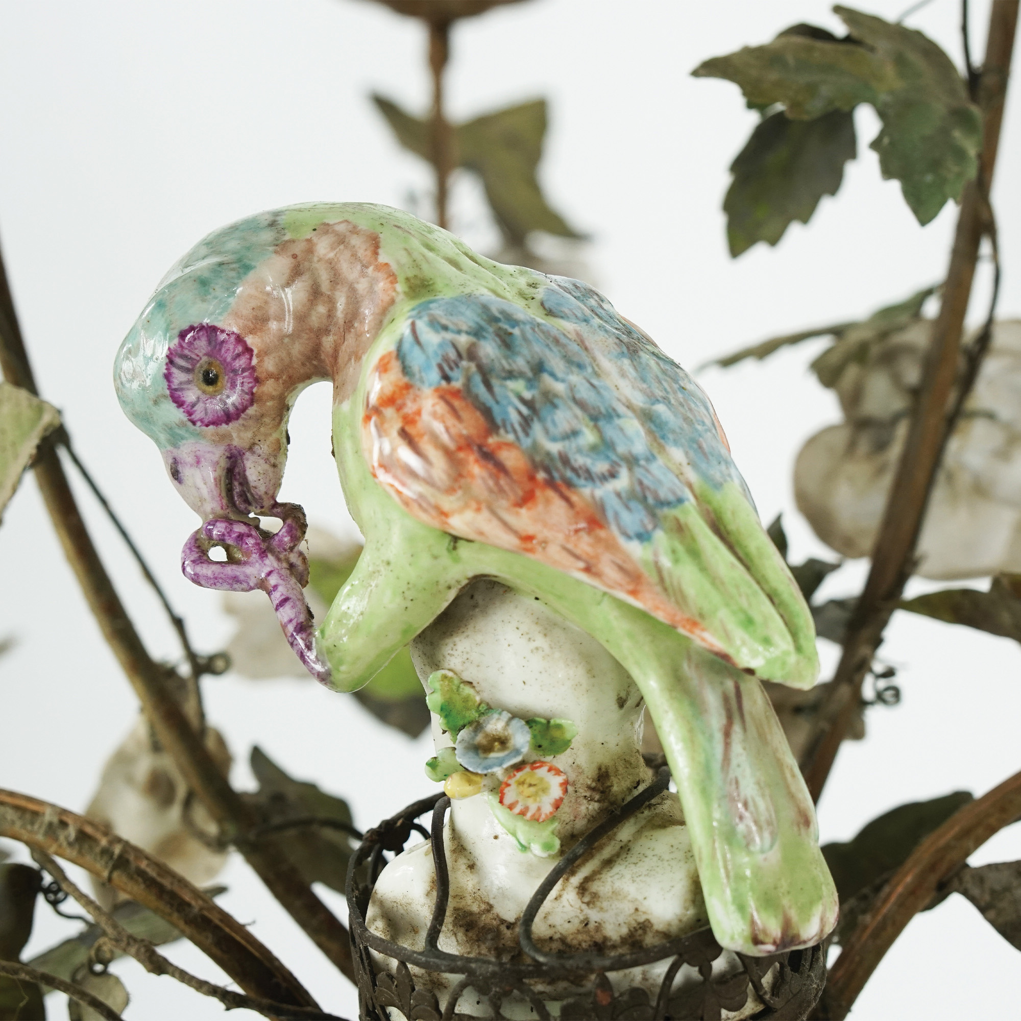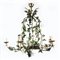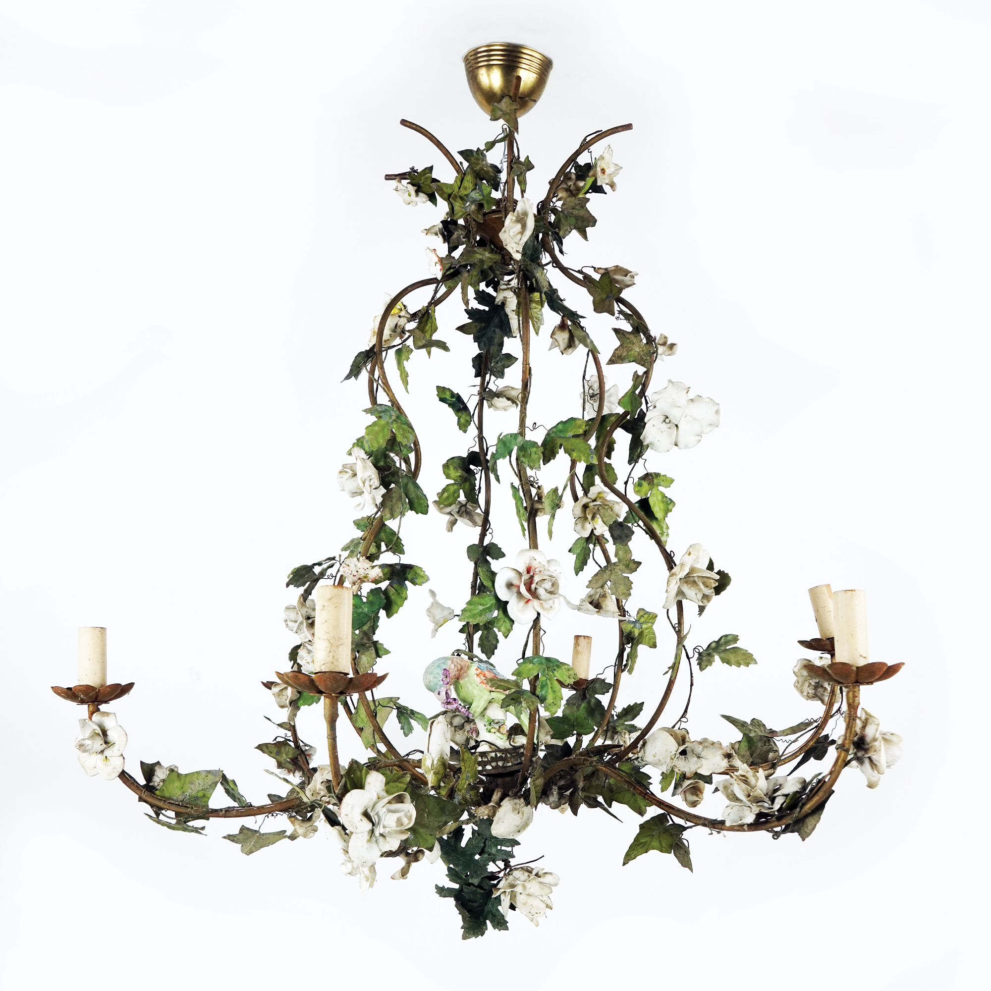 Lampadario a corbeille a sei luci; struttura in ferro battuto su cui si avviluppano rami di edera con rose e altre specie floreali in biscuit. Al centro svetta un pappagallo in porcellana policroma.