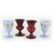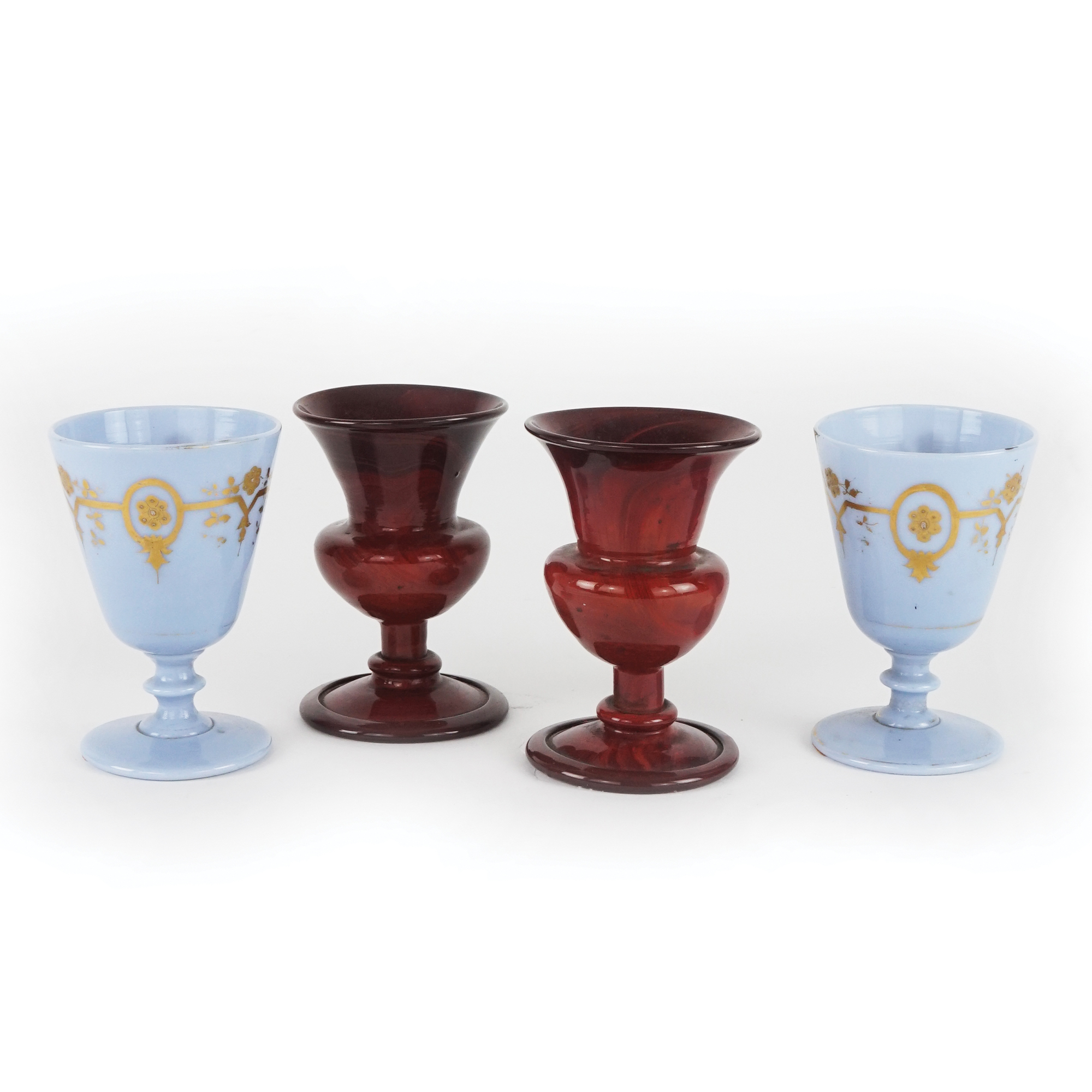 Coppia di piccoli vasi in vetro soffiato rosso a imitazione del marmo UNITI a una coppia di bicchieri in opaline celeste con decorazioni dorate.