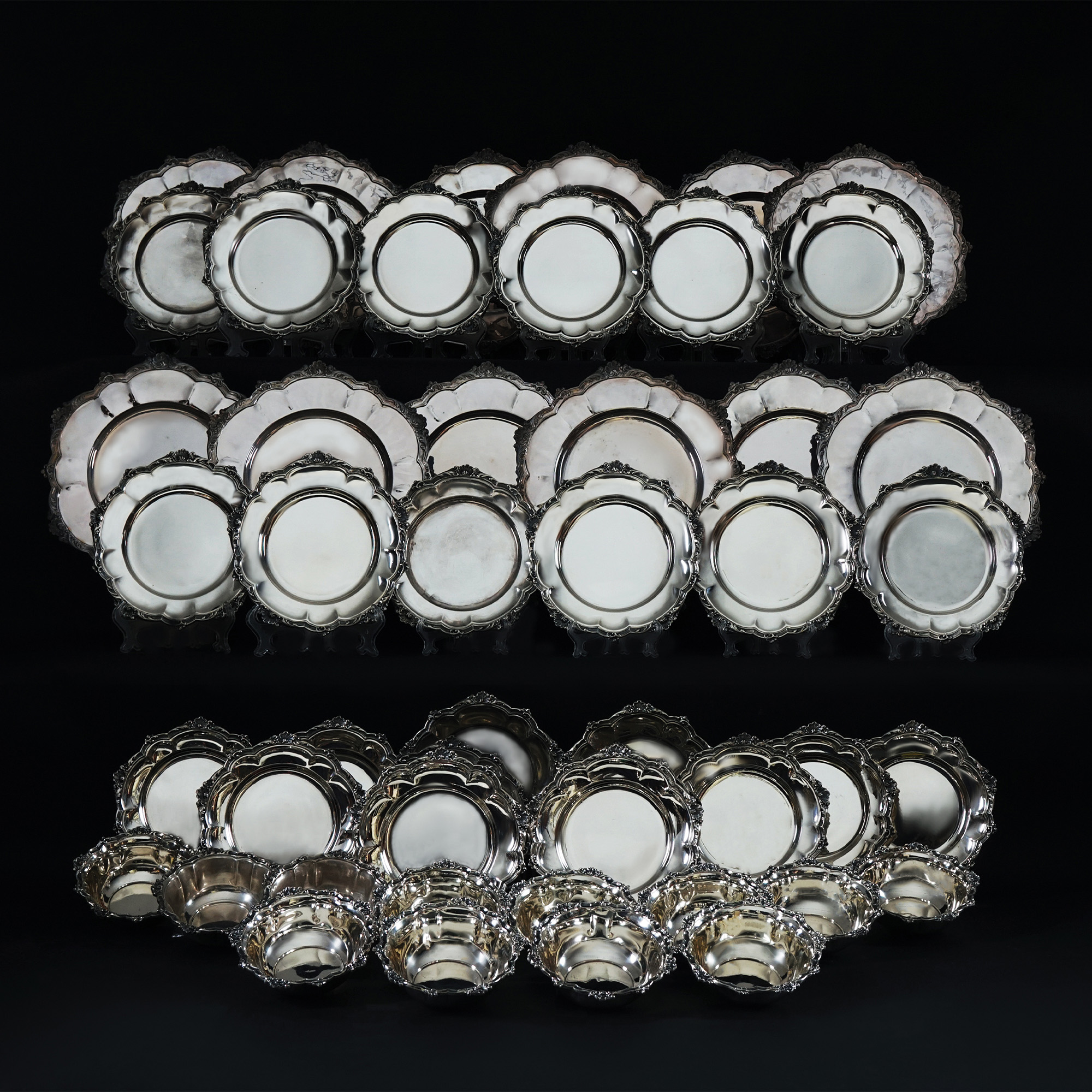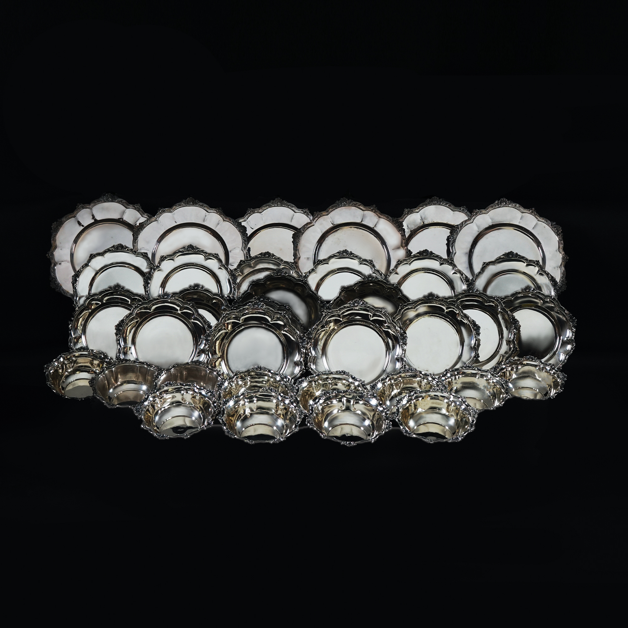 Servizio da tavola in argento composto da 48 pezzi comprendenti 12 sottopiatti, 12 piatti da dolce e 12 bowls da macedonia con relativo piattino; profilo dei bordi cesellato a volute.