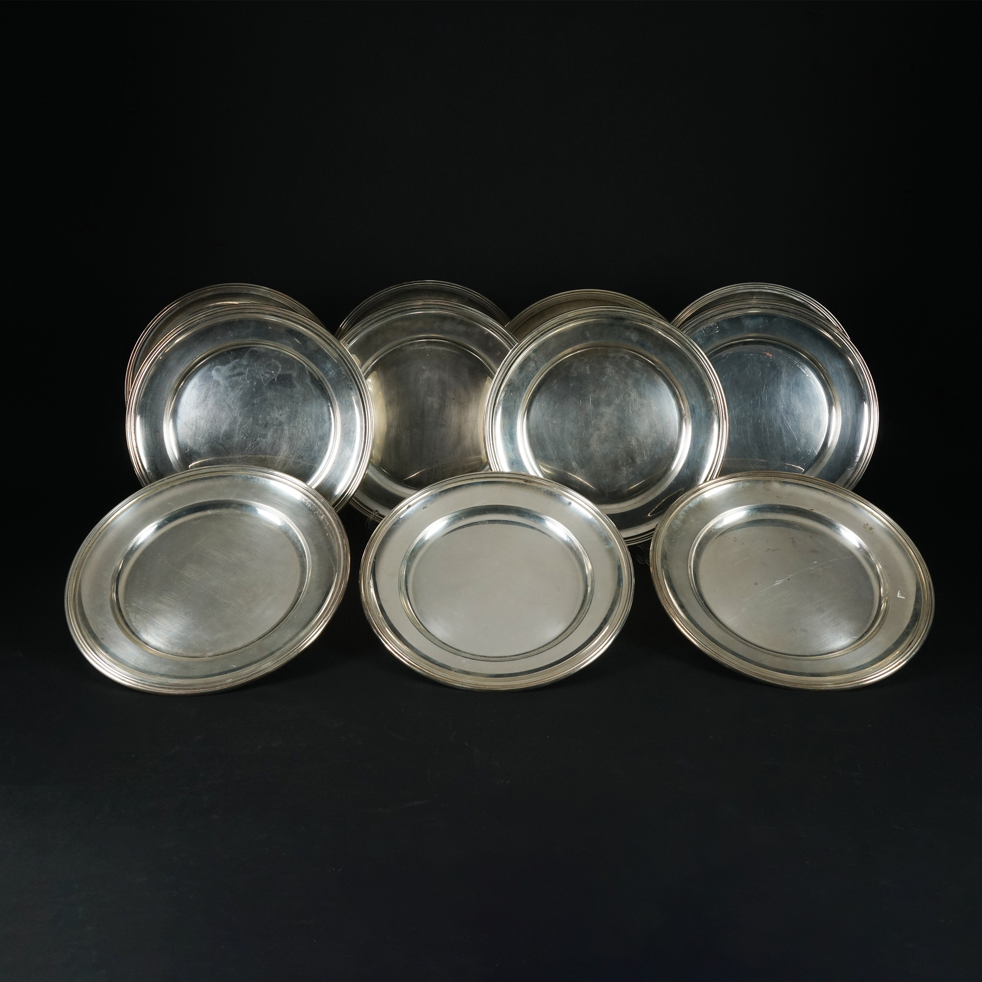Undici sottopiatti in argento a superficie liscia con profilo del bordo modanato.