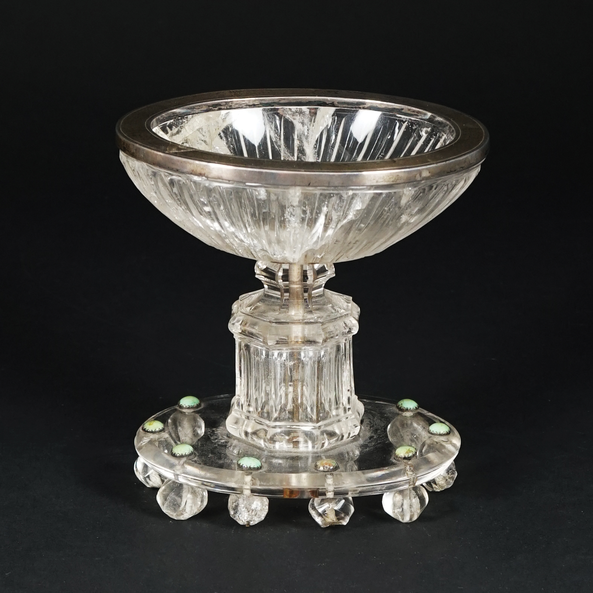 Coppa in cristallo di rocca; recipiente di forma ovale montato in argento, decorato a baccellature su stelo a sezione ottagonale; base ovale decorata da dieci turchesi cabochon.