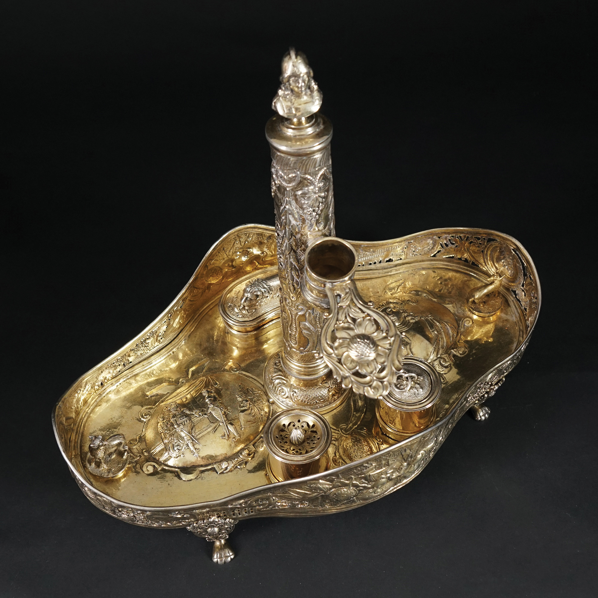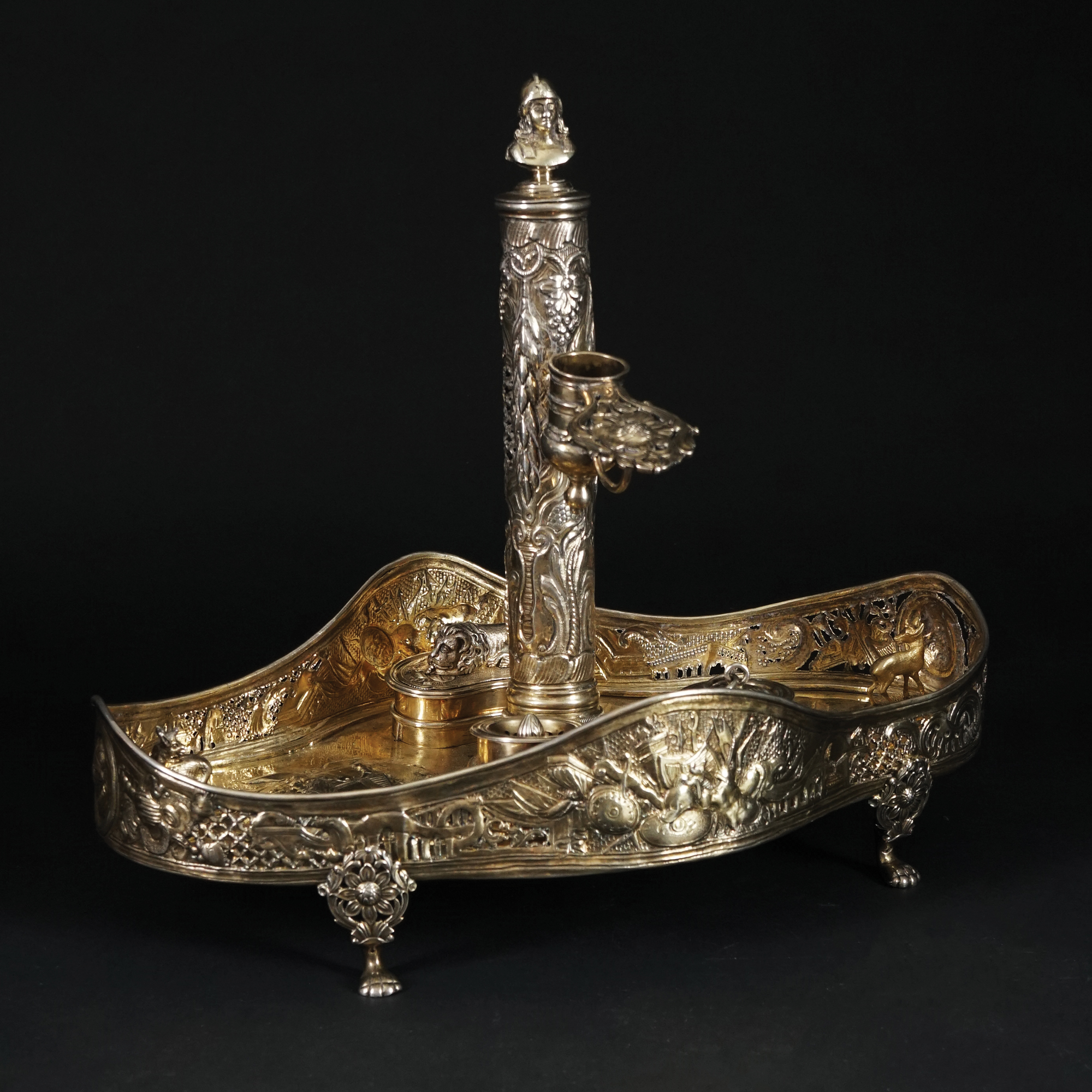 Calamaio in argento dorato con vassoio sagomato; nel cavetto due medaglioni recano un ritratto virile ed una scena d'interno; ai lati due piccole sculture raffiguranti caprette; tre recipienti all'uopo centrati da una colonna sbalzata a motivi floreali sormontata da busto di soldato; piedi ferini.