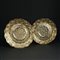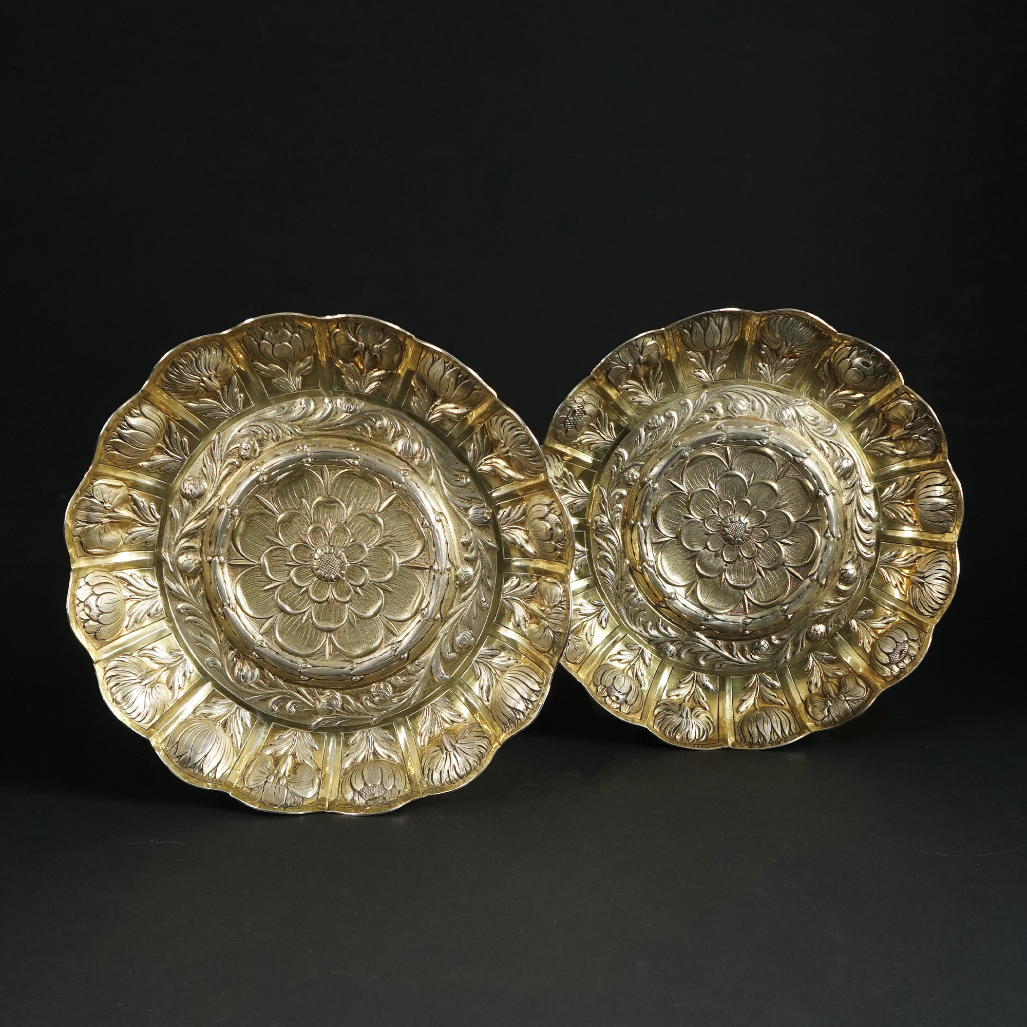 Coppia di piatti in argento sterling dorato finemente cesellati a corolla e sbalzati a motivi fogliati.