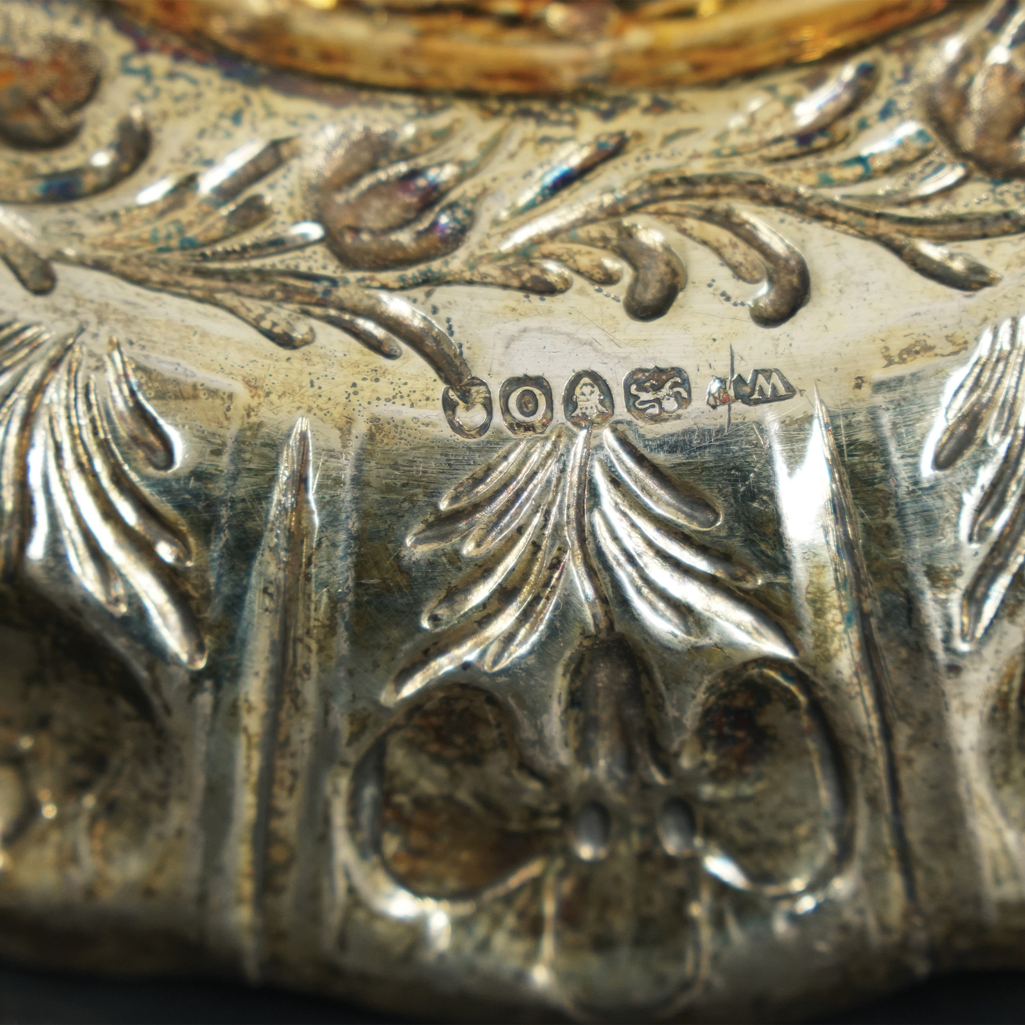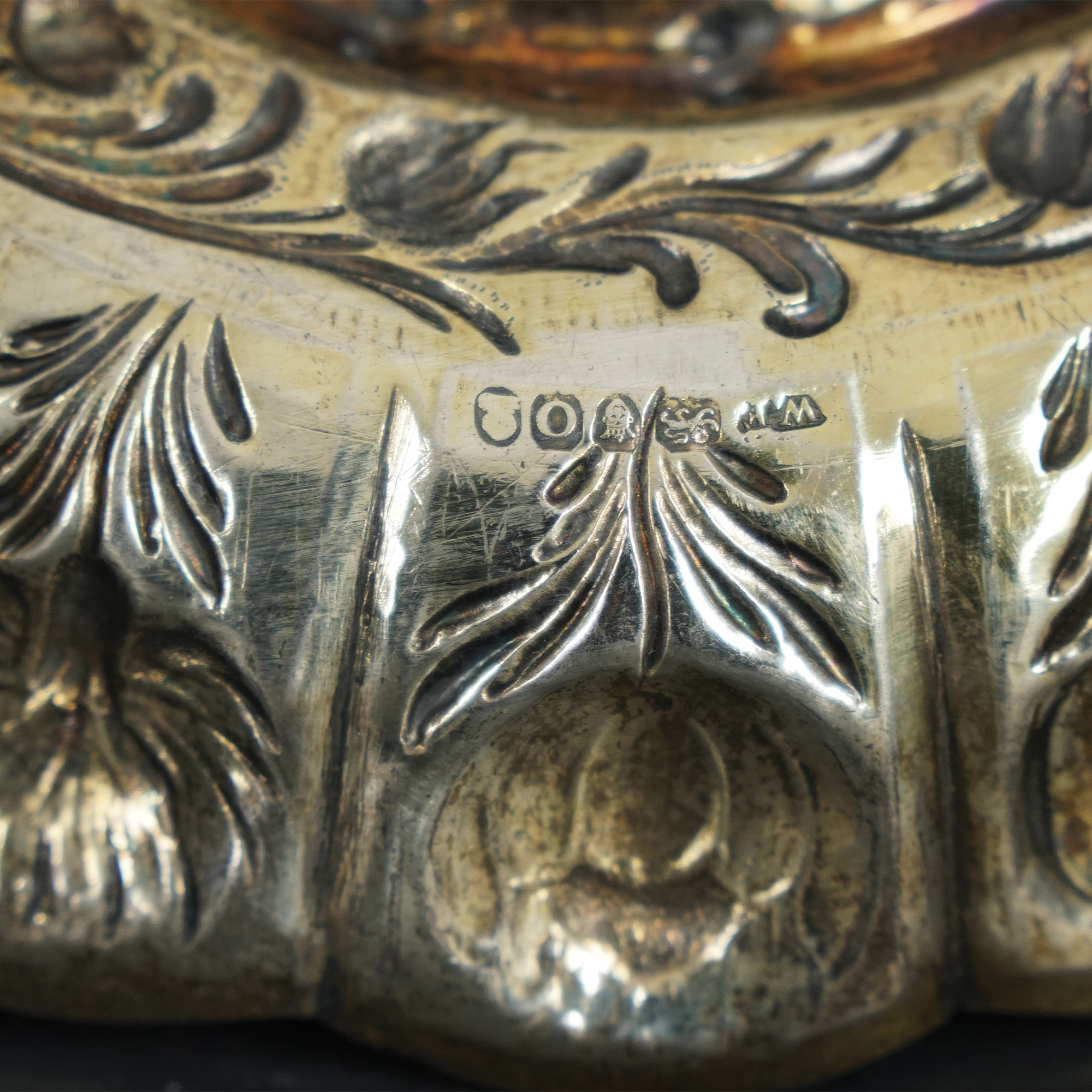 Coppia di piatti in argento sterling dorato finemente cesellati a corolla e...