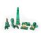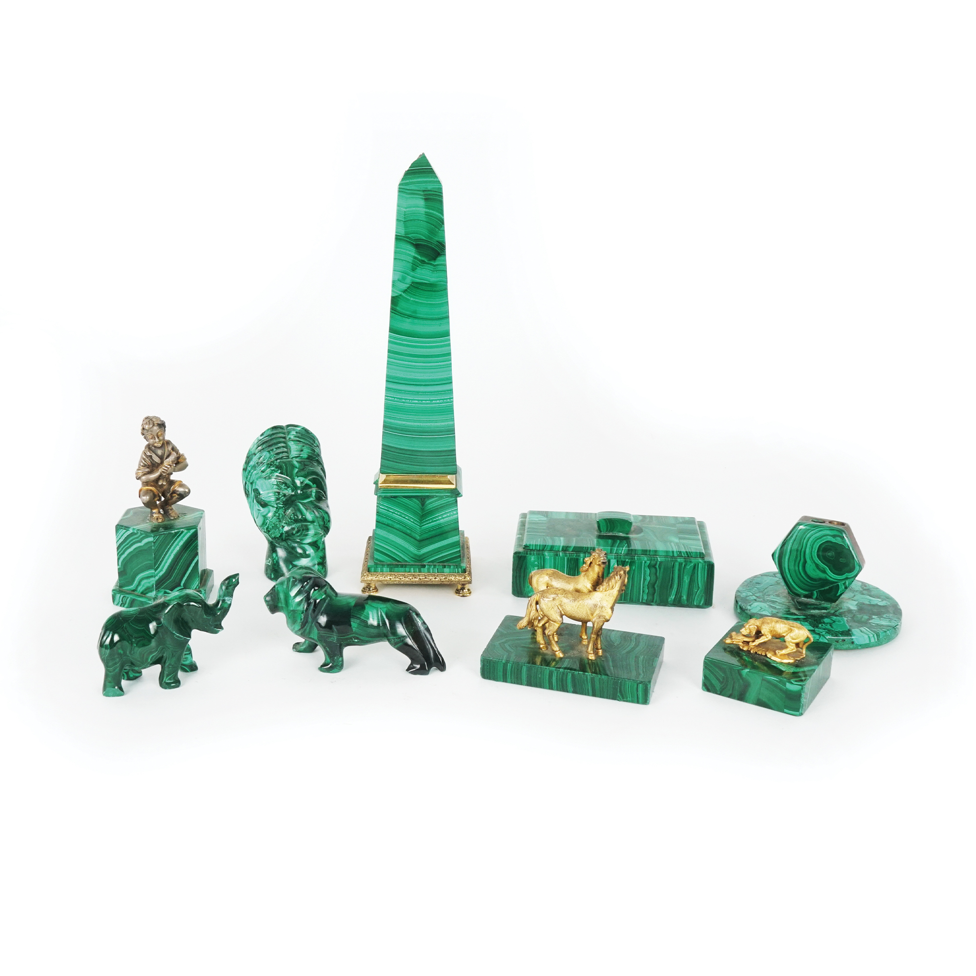Obelisco placcato in malachite con base in argento dorato UNITO a tre sculture in argento dorato su base placcata in malachite, a due figure di animali, a una testa africana, a un portapenne e a una scatola, parimenti in malachite, l'obelisco h. cm. 30 (qualche difetto e sbeccatura)