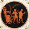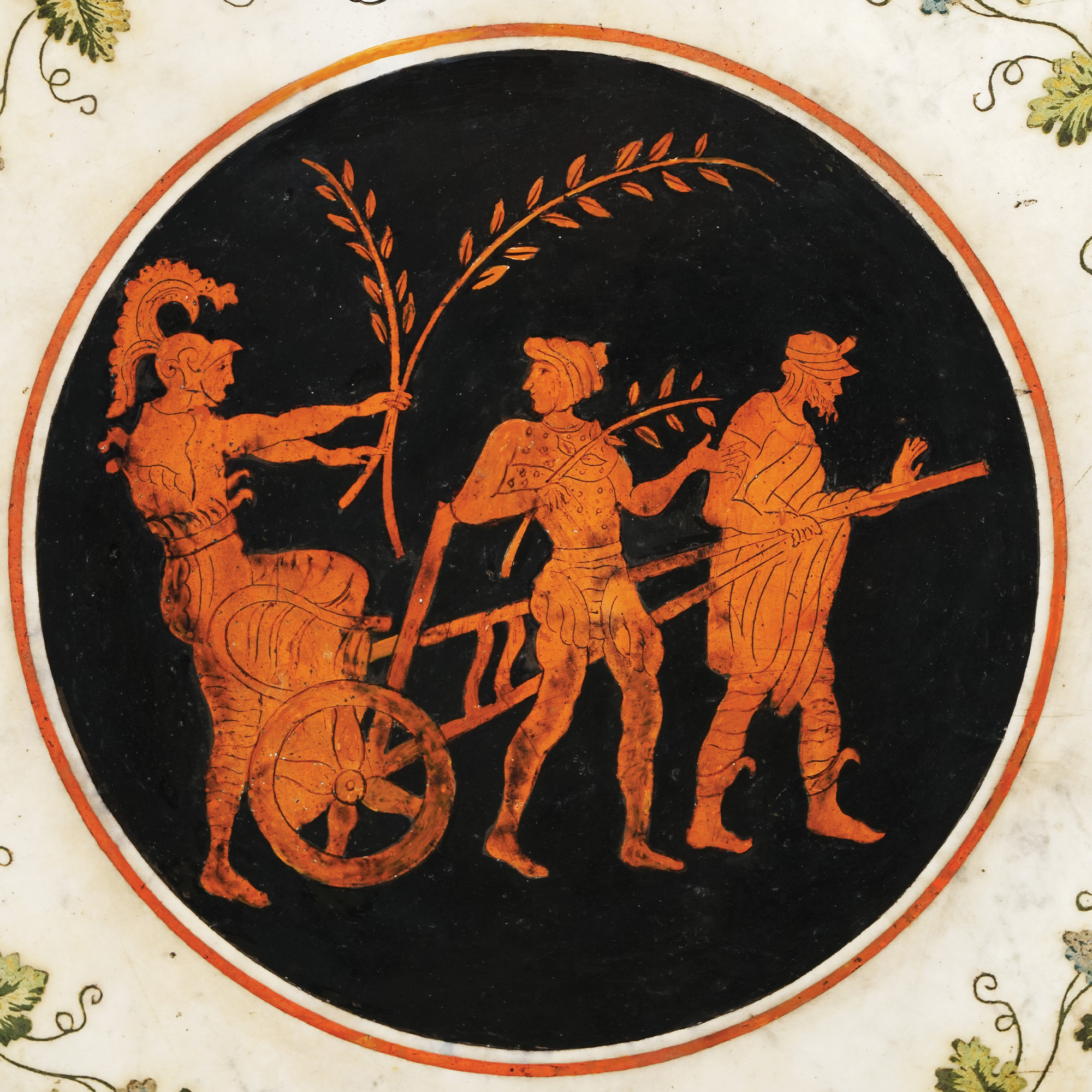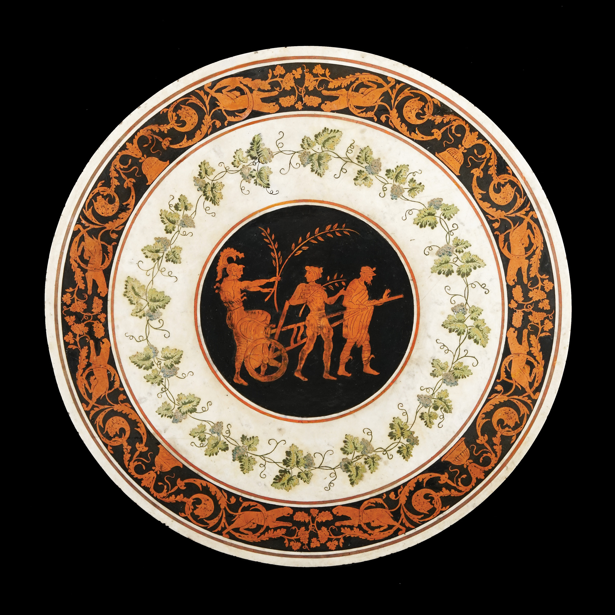 Piano circolare in marmo bianco e scagliola: al centro campeggia una scena classica a figure rosse con condottiero su biga su campo nero. Tale scena è ben circoscritta da una ghirlanda di pampini seguita da una cornice a rinceaux vegetali su cui posano felini, anch'essa resa in cromia rossa su fondo nero.