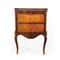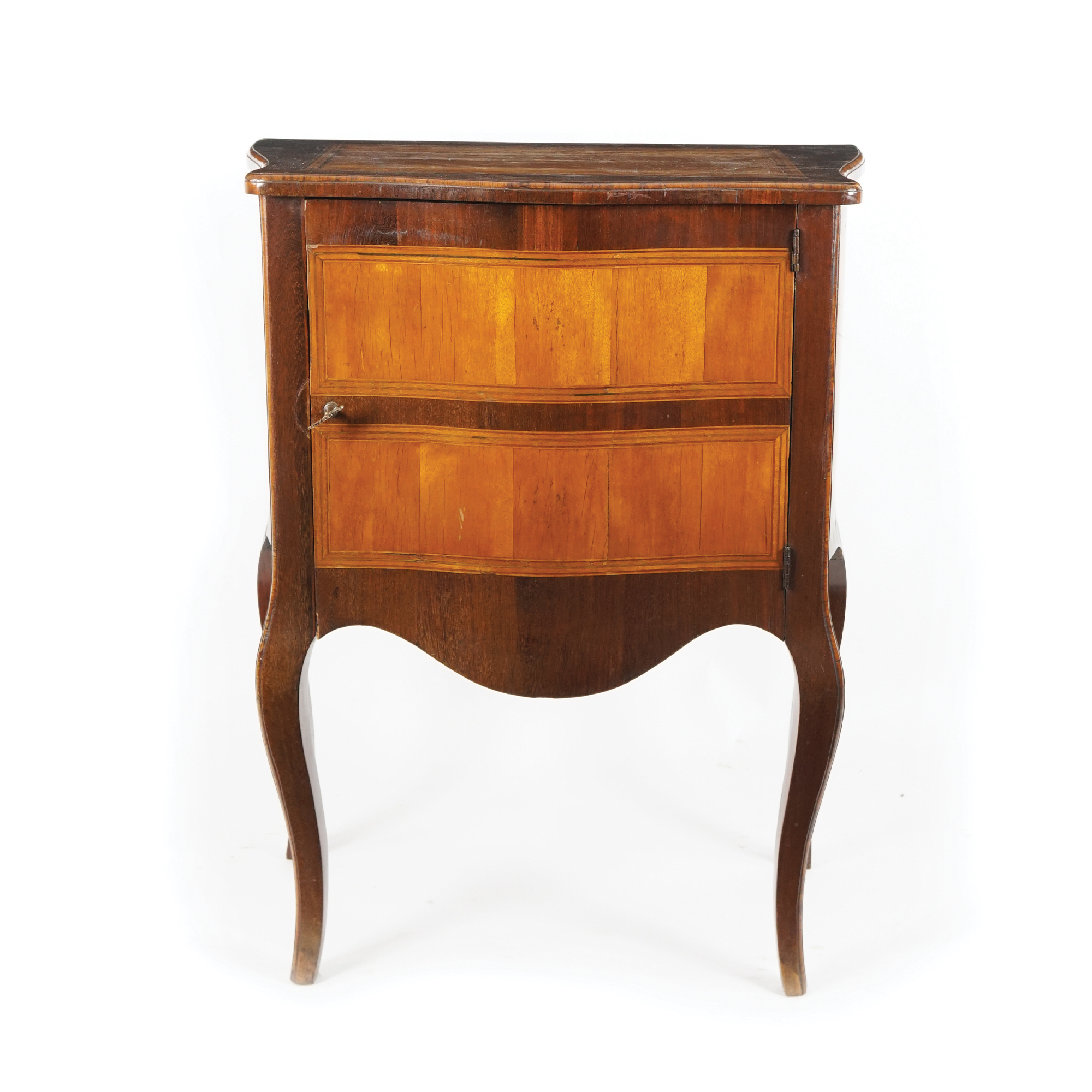 Credenzino lastronato in varie essenze; piano sagomato; fronte bombato scandito da due cassetti simulati trasformati in portina. Grembiule centinato; gambe a voluta.