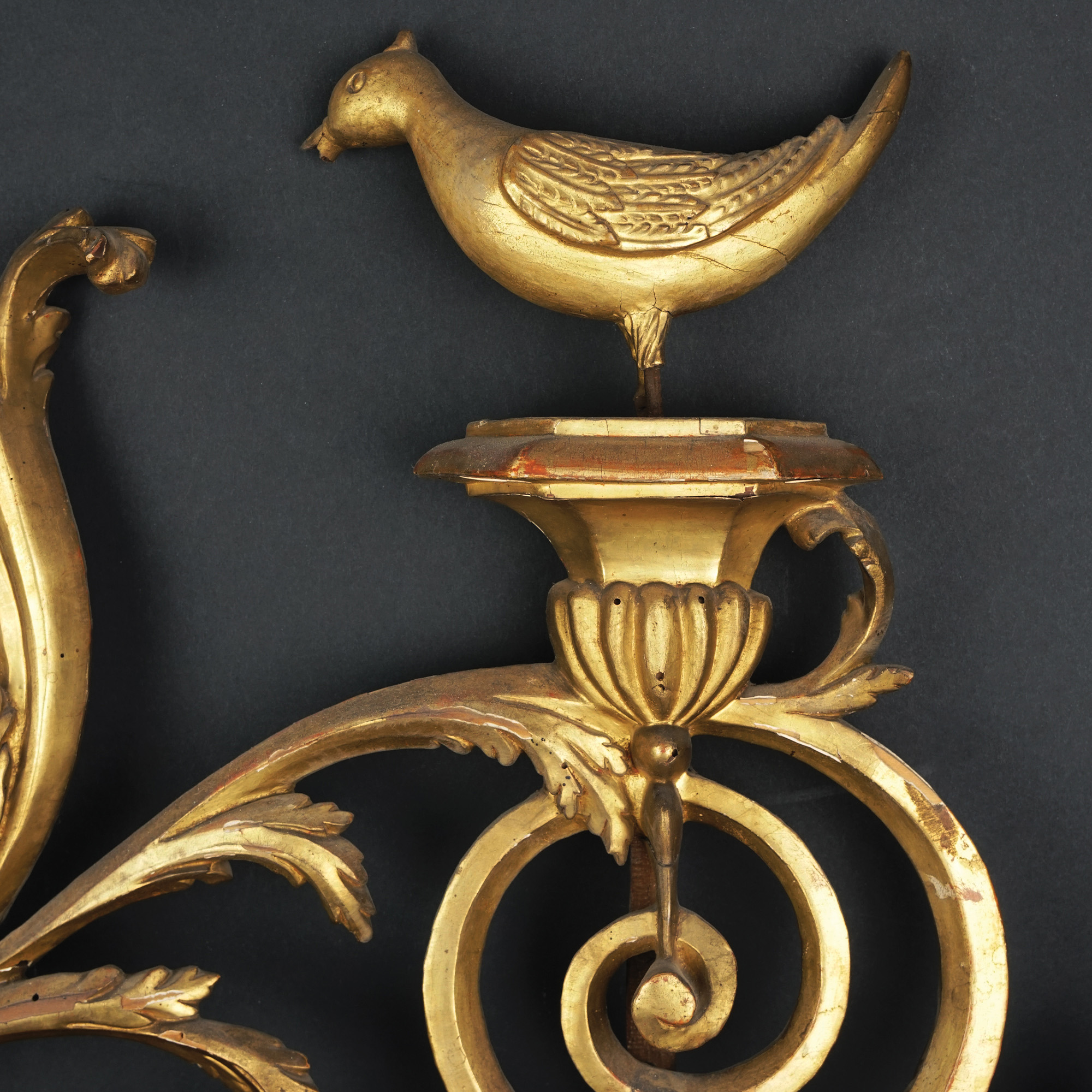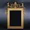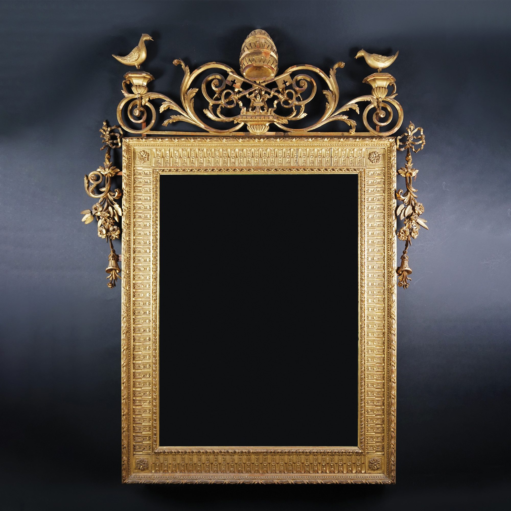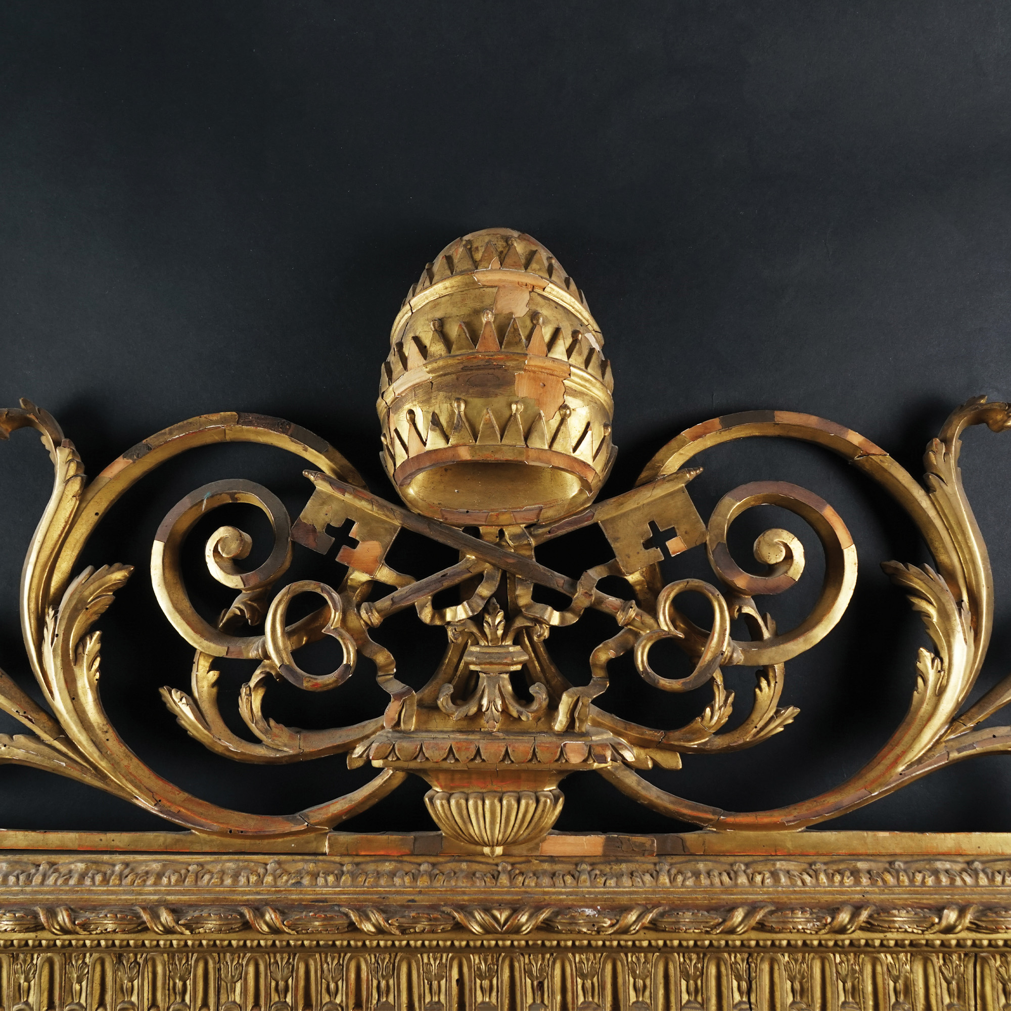 Importante cornice di impianto verticale in legno dorato. Fascia mediana piatta scolpita a scanalature alternate a piccoli motivi fogliati, chiusa all'esterno da una sequenza di foglie d'acanto legate da un nastro attorcigliato: due fiocchi che trattengono una cascatella di fiori e foglie completano l'ornato dei lati verticali; la battuta presenta un motivo intagliato a nastrino ritorto. Cimasa qualificata al centro da uno stemma papale affiancato da due grandi volute che sostengono due mensoline sulle quali si posano due volatili.