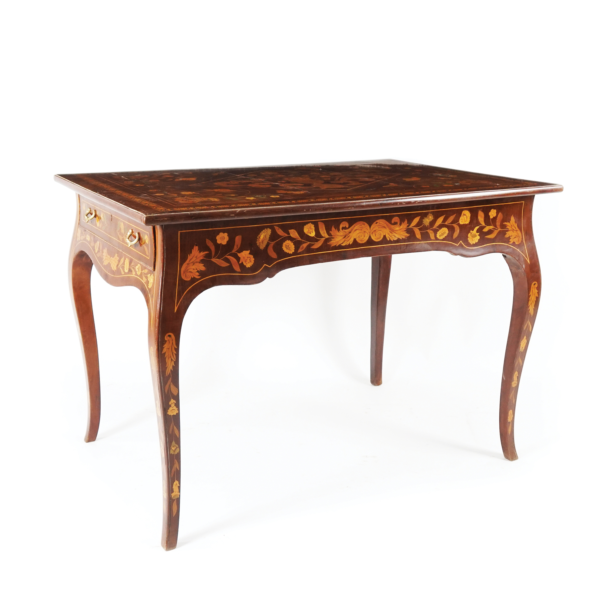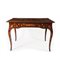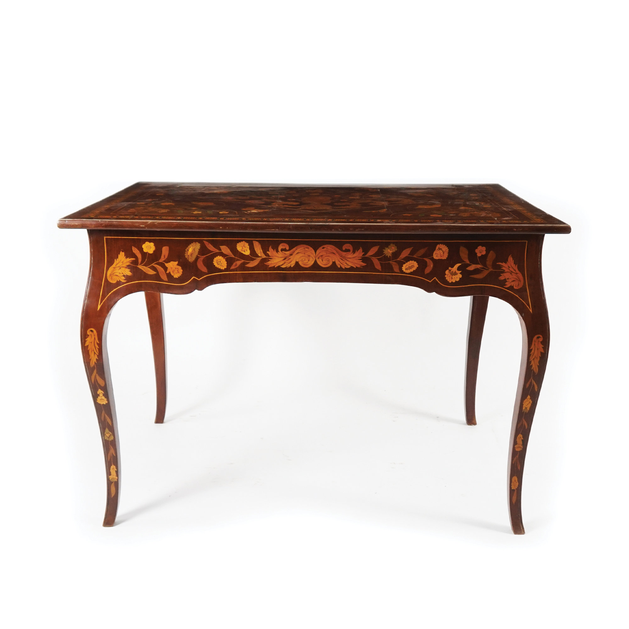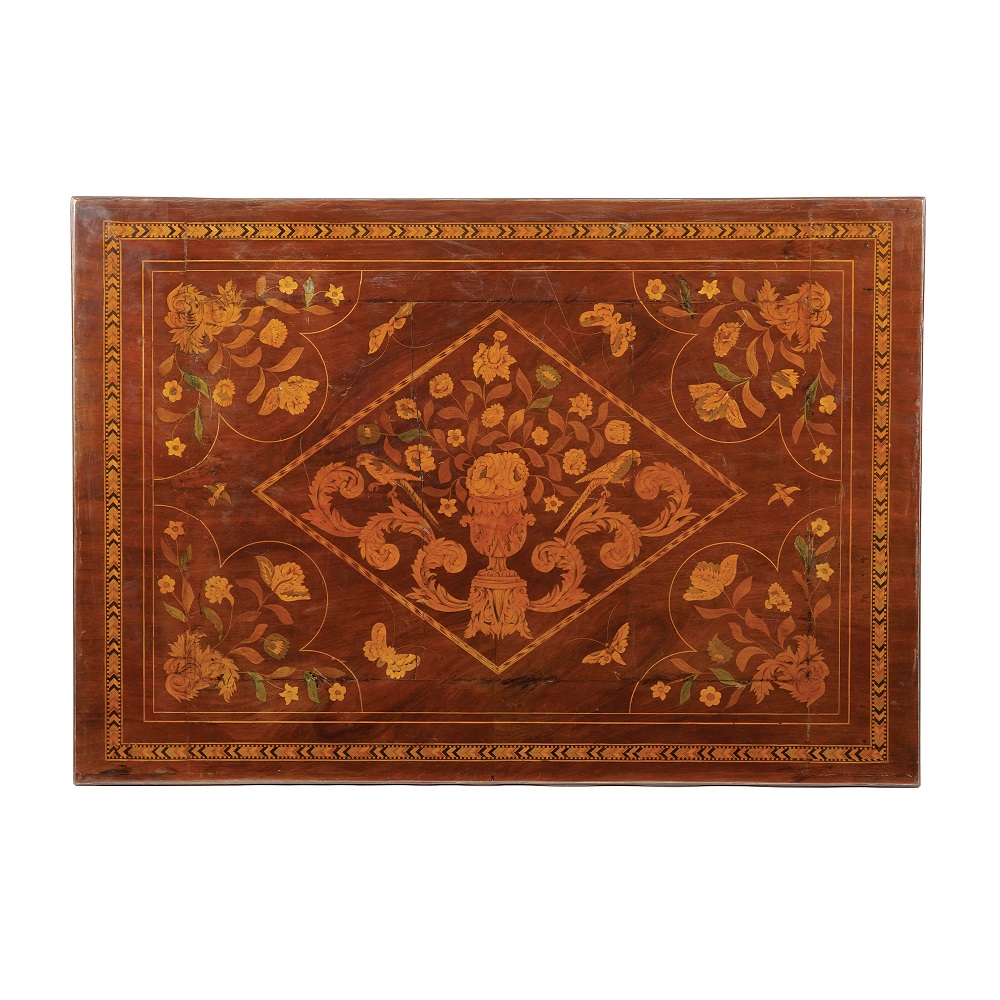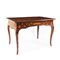 Tavolo da centro impiallacciato in noce e finemente intarsiato in legni di varie essenze a raffigurare motivi floreali e insetti; fascia sottostante il piano dal profilo centinato; gambe a voluta. Due cassetti sui lati corti.