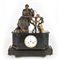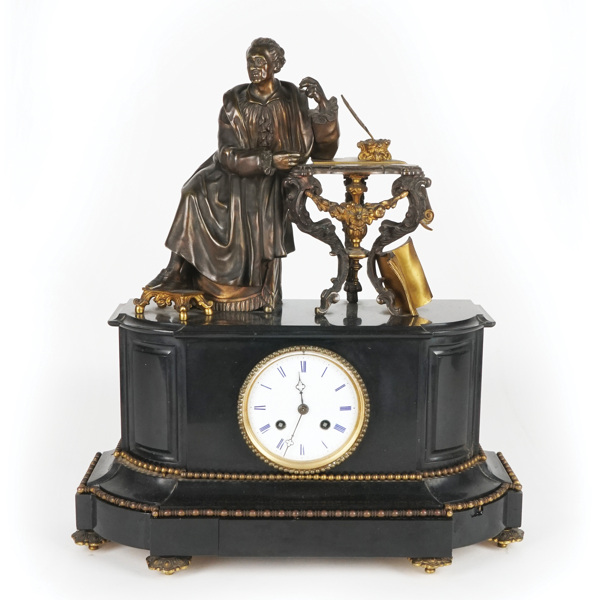 Pendola da tavolo con cassa modanata in marmo nero del Belgio, centrata dal quadrante circolare in smalto bianco con indici in numeri romani. Superiormente la figura di uno scrittore poggiato a un tavolino a tripode in bronzo patinato completa l'ornato.