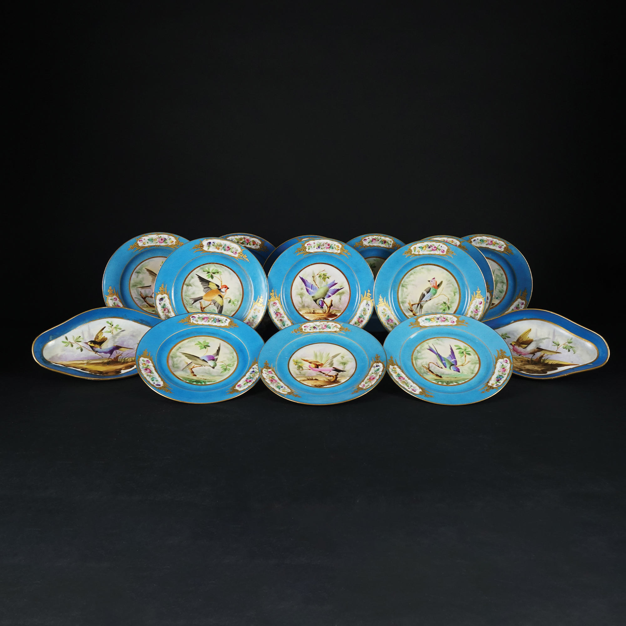 Dodici piatti e due raviere di forma ovale in porcellana turchese, policroma e dorata dipinta a volatili su rami; la tesa dei piatti ospita riserve floreali.