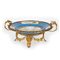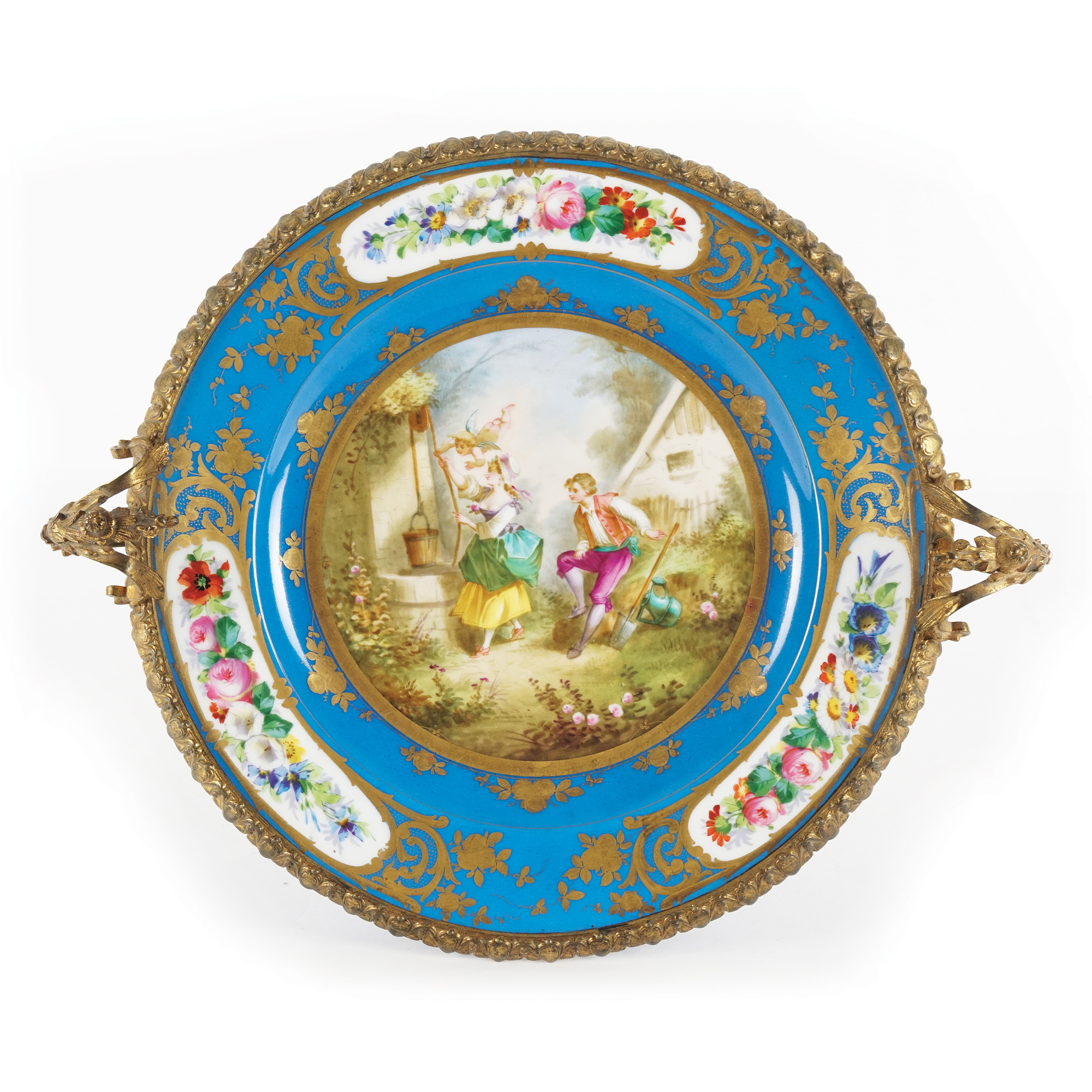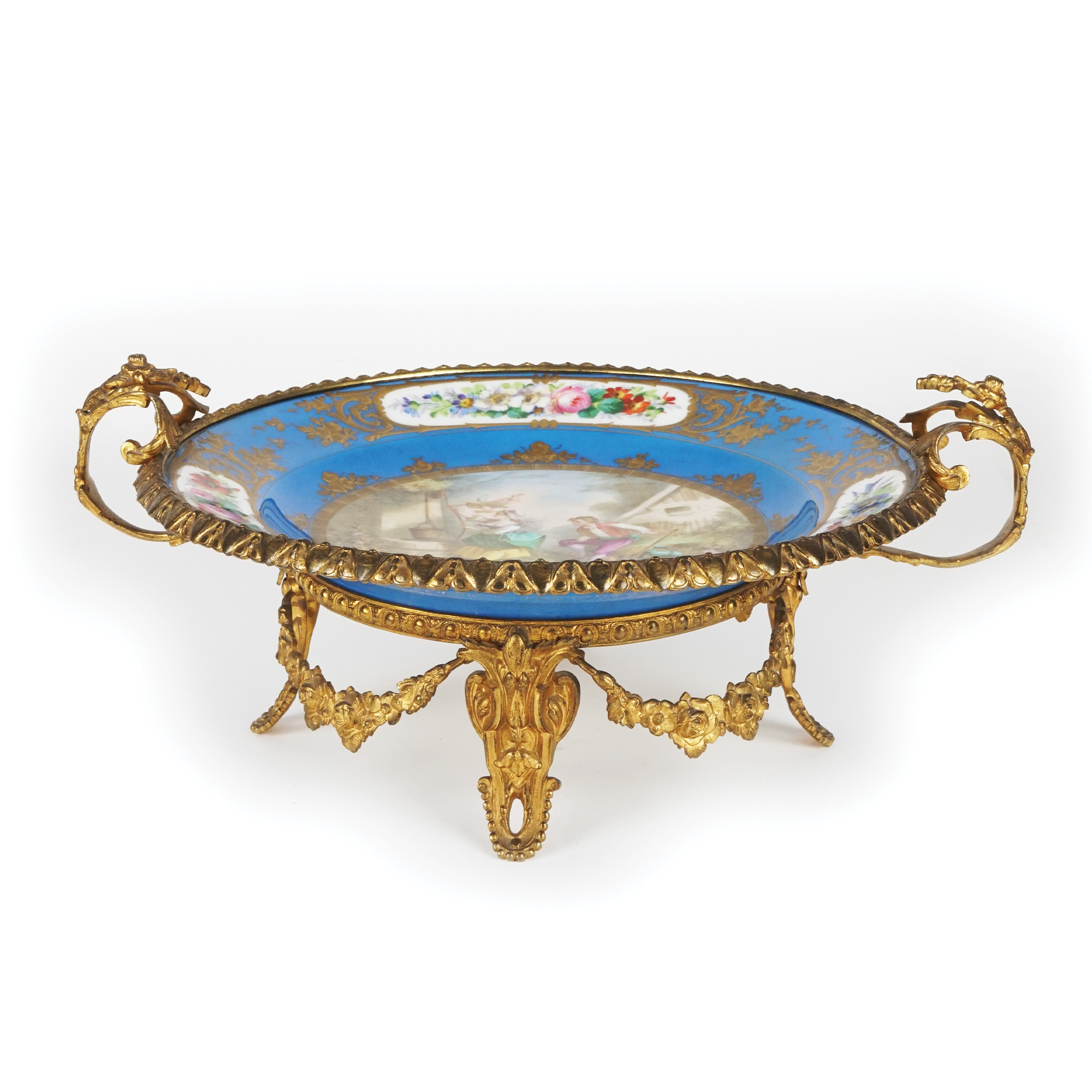 Alzata in porcellana azzurra, dorata e policroma, dipinta sulla tesa a riserve floreali e nel cavetto a scena galante; montatura di bronzo cesellato e dorato.