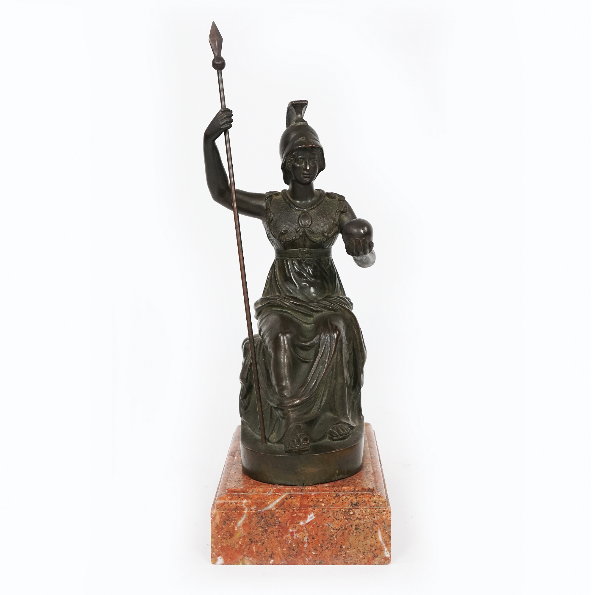 Scultura in bronzo patinato raffigurante Minerva seduta; base rettangolare in marmo rosso.