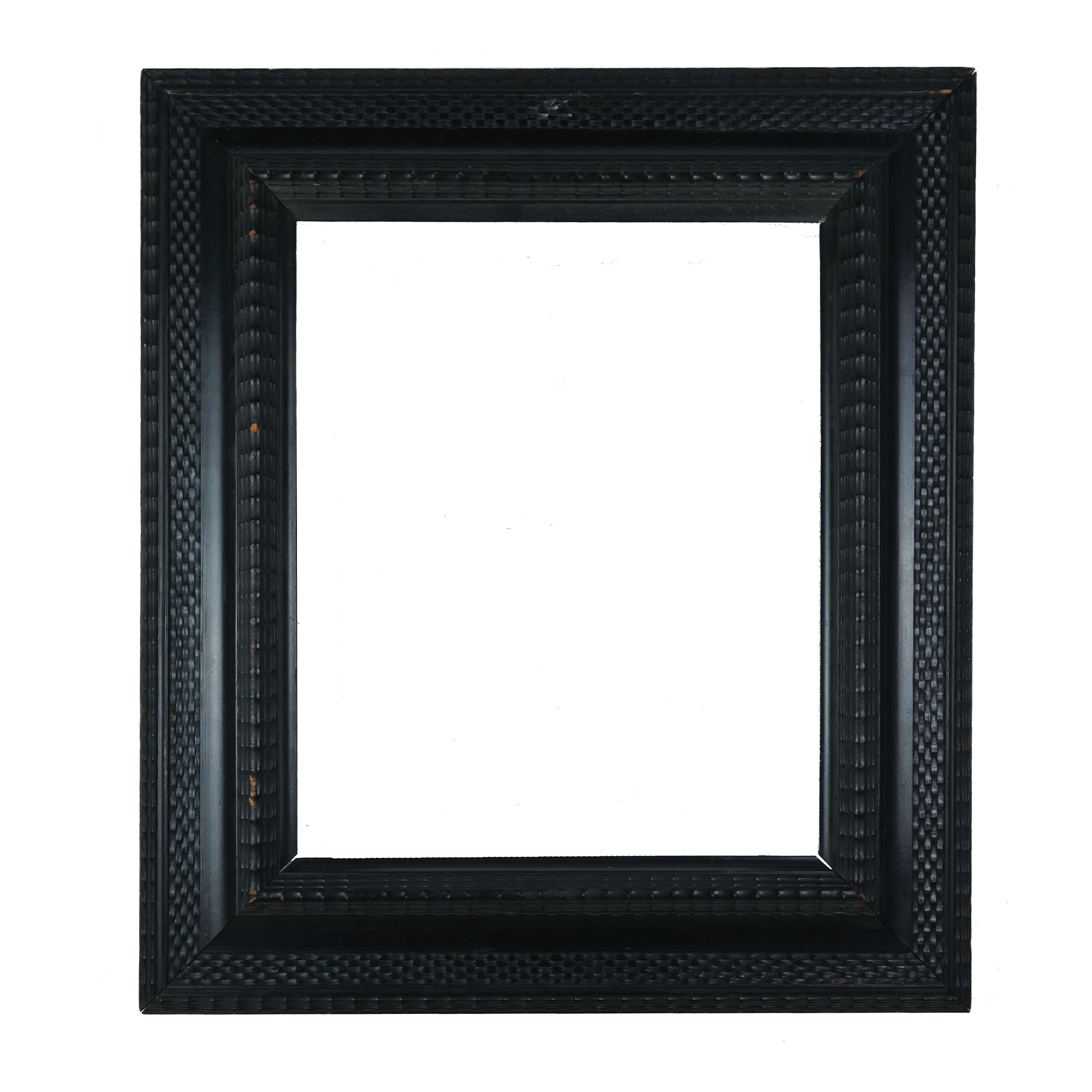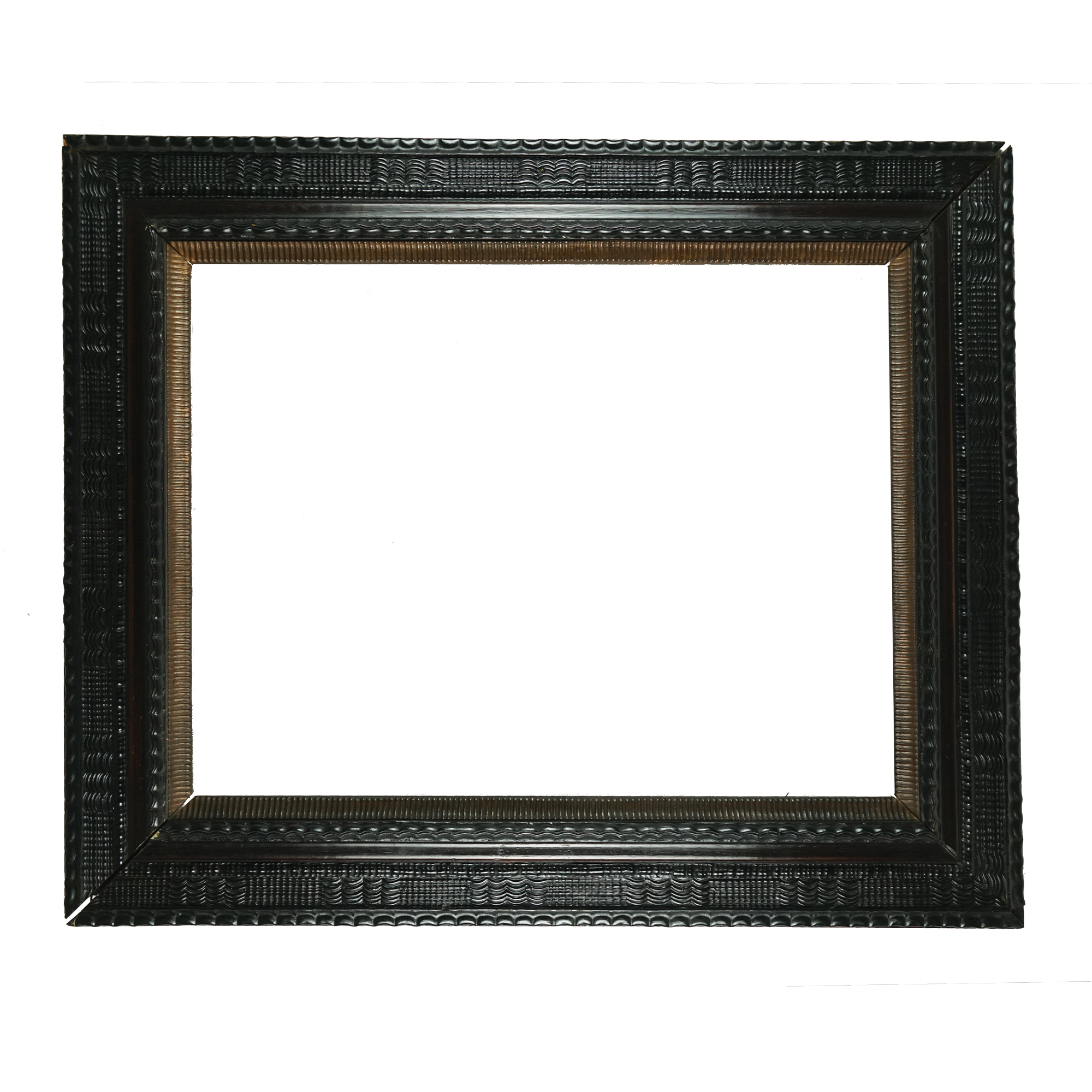 Due cornici guillochè in legno ebanizzato, la cornice piccola: luce cm. 40,5x34; battuta cm. 43,5x36,5; massimo ingombro cm. 62x54; la cornice grande: luce cm. 62x47; battuta cm. 65x50; massimo ingombro cm. 85x70