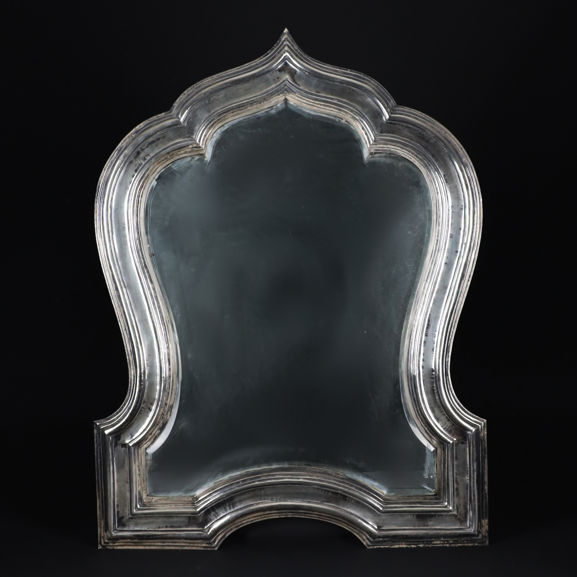 Specchiera di forma centinata con cornice modanata rivestita in argento sterling.
